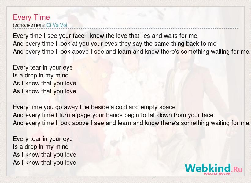 Every time I see your face I know the love that lies and waits for me And every time I look at you your eyes they say the same thing back to me And every time I look above I see and learn and know there's something waiting for me. Every tear in your eye Is a drop in my mind As I know that you love As I know that you love Every time you go away I lie beside a cold and empty space And every time I turn a page your hands begin to fall down from your face And every time I look above I see and learn and know there's something waiting for me. Every tear in your eye Is a drop in my mind As I know that you love As I know that you love