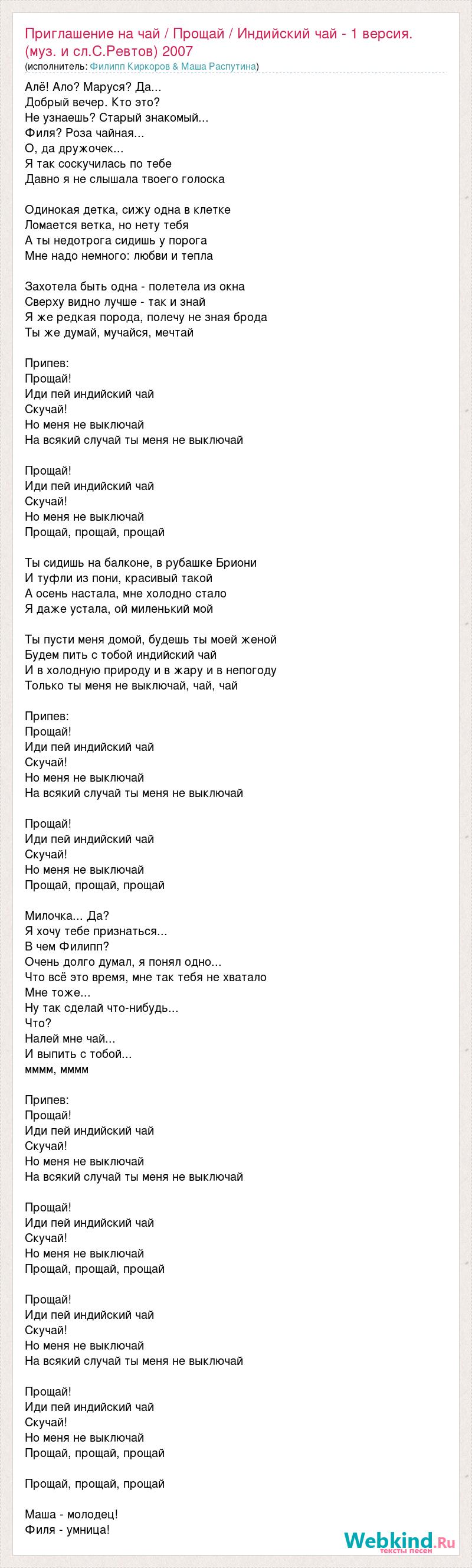 Алё! Ало? Маруся? Да... Добрый вечер. Кто это? Не узнаешь? Старый знакомый... Филя? Роза чайная... О, да дружочек... Я так соскучилась по тебе Давно я не слышала твоего голоска Одинокая детка, сижу одна в клетке Ломается ветка, но нету тебя А ты недотрога сидишь у порога Мне надо немного: любви и тепла Захотела быть одна - полетела из окна Сверху видно лучше - так и знай Я же редкая порода, полечу не зная брода Ты же думай, мучайся, мечтай Припев: Прощай! Иди пей индийский чай Скучай! Но меня не выключай На всякий случай ты меня не выключай Прощай! Иди пей индийский чай Скучай! Но меня не выключай Прощай, прощай, прощай Ты сидишь на балконе, в рубашке Бриони И туфли из пони, красивый такой А осень настала, мне холодно стало Я даже устала, ой миленький мой Ты пусти меня домой, будешь ты моей женой Будем пить с тобой индийский чай И в холодную природу и в жару и в непогоду Только ты меня не выключай, чай, чай Припев: Прощай! Иди пей индийский чай Скучай! Но меня не выключай На всякий случай ты меня не выключай Прощай! Иди пей индийский чай Скучай! Но меня не выключай Прощай, прощай, прощай Милочка... Да? Я хочу тебе признаться... В чем Филипп? Очень долго думал, я понял одно... Что всё это время, мне так тебя не хватало Мне тоже... Ну так сделай что-нибудь... Что? Налей мне чай... И выпить с тобой... мммм, мммм Припев: Прощай! Иди пей индийский чай Скучай! Но меня не выключай На всякий случай ты меня не выключай Прощай! Иди пей индийский чай Скучай! Но меня не выключай Прощай, прощай, прощай Прощай! Иди пей индийский чай Скучай! Но меня не выключай На всякий случай ты меня не выключай Прощай! Иди пей индийский чай Скучай! Но меня не выключай Прощай, прощай, прощай Прощай, прощай, прощай Маша - молодец! Филя - умница!