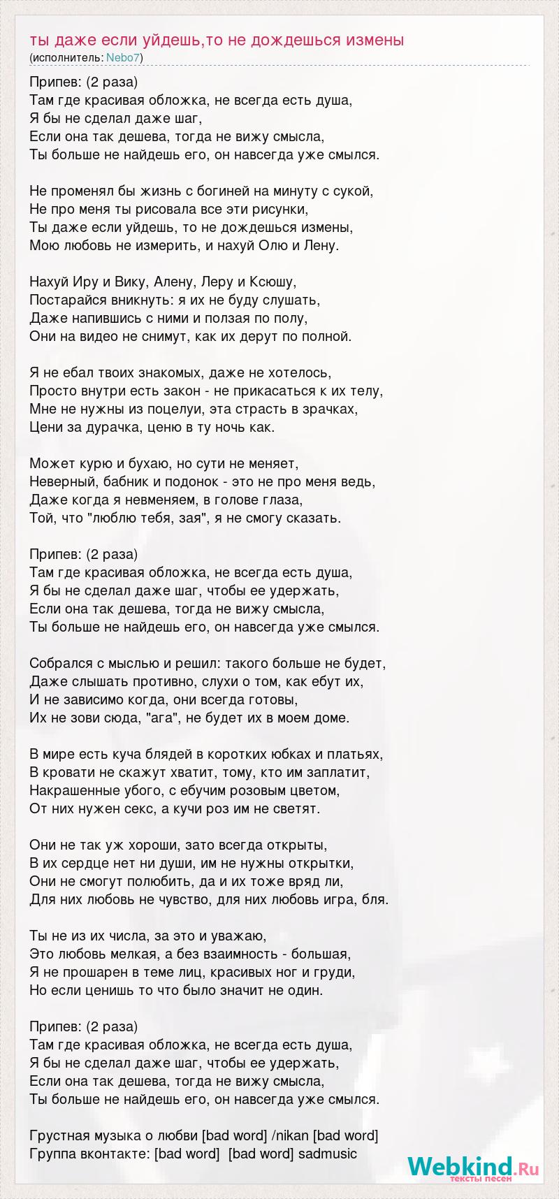 Припев: (2 раза) Там где красивая обложка, не всегда есть душа, Я бы не сделал даже шаг, Если она так дешева, тогда не вижу смысла, Ты больше не найдешь его, он навсегда уже смылся. Не променял бы жизнь с богиней на минуту с сукой, Не про меня ты рисовала все эти рисунки, Ты даже если уйдешь, то не дождешься измены, Мою любовь не измерить, и нахуй Олю и Лену. Нахуй Иру и Вику, Алену, Леру и Ксюшу, Постарайся вникнуть: я их не буду слушать, Даже напившись с ними и ползая по полу, Они на видео не снимут, как их дерут по полной. Я не ебал твоих знакомых, даже не хотелось, Просто внутри есть закон - не прикасаться к их телу, Мне не нужны из поцелуи, эта страсть в зрачках, Цени за дурачка, ценю в ту ночь как. Может курю и бухаю, но сути не меняет, Неверный, бабник и подонок - это не про меня ведь, Даже когда я невменяем, в голове глаза, Той, что "люблю тебя, зая", я не смогу сказать. Припев: (2 раза) Там где красивая обложка, не всегда есть душа, Я бы не сделал даже шаг, чтобы ее удержать, Если она так дешева, тогда не вижу смысла, Ты больше не найдешь его, он навсегда уже смылся. Собрался с мыслью и решил: такого больше не будет, Даже слышать противно, слухи о том, как ебут их, И не зависимо когда, они всегда готовы, Их не зови сюда, "ага", не будет их в моем доме. В мире есть куча блядей в коротких юбках и платьях, В кровати не скажут хватит, тому, кто им заплатит, Накрашенные убого, с ебучим розовым цветом, От них нужен секс, а кучи роз им не светят. Они не так уж хороши, зато всегда открыты, В их сердце нет ни души, им не нужны открытки, Они не смогут полюбить, да и их тоже вряд ли, Для них любовь не чувство, для них любовь игра, бля. Ты не из их числа, за это и уважаю, Это любовь мелкая, а без взаимность - большая, Я не прошарен в теме лиц, красивых ног и груди, Но если ценишь то что было значит не один. Припев: (2 раза) Там где красивая обложка, не всегда есть душа, Я бы не сделал даже шаг, чтобы ее удержать, Если она так дешева, тогда не вижу смысла, Ты больше не найдешь его, он навсегда уже смылся. Грустная музыка о любви [bad word] /nikan [bad word] Группа вконтакте: [bad word] [bad word] sadmusic