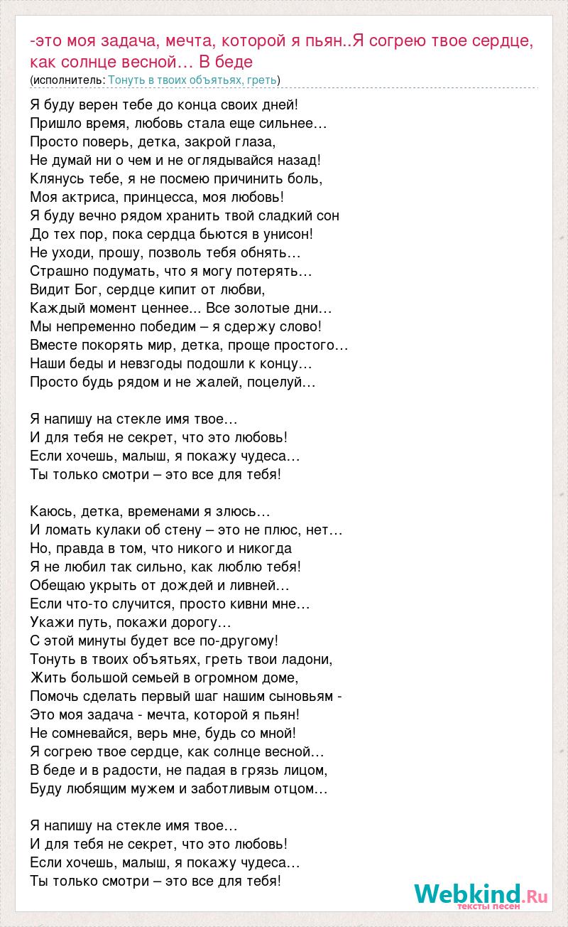 Главная→Исполнители→Тонуть в твоих объятьях, греть→-это моя задача, мечта, которой я пьян..Я согрею твое сердце, как солнц