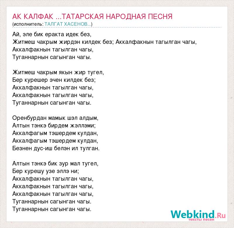 Ай, эле бик еракта идек без, Житмеш чакрым жирдэн килдек без; Аккалфакнын тагылган чагы, Аккалфакнын тагылган чагы, Туганнарнын сагынган чагы. Житмеш чакрым якын жир тугел, Бер курешер эчен килдек без; Аккалфакнын тагылган чагы, Аккалфакнын тагылган чагы, Туганнарнын сагынган чагы. Оренбурдан мамык шэл алдым, Алтын тэнкэ бирдем жэллэми; Аккалфагым тэшердем кулдан, Аккалфагым тэшердем кулдан, Безнен дус-иш белэн ил тулган. Алтын тэнкэ бик зур мал тугел, Бер курешу узе эллэ ни; Аккалфакнын тагылган чагы, Аккалфакнын тагылган чагы, Аккалфакнын тагылган чагы, Туганнарнын сагынган чагы. Туганнарнын сагынган чагы.