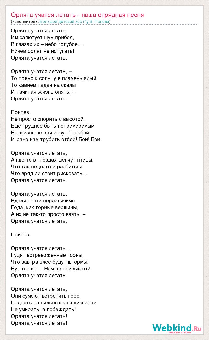 Орлята учатся летать. Им салютует шум прибоя, В глазах их – небо голубое… Ничем орлят не испугать! Орлята учатся летать. Орлята учатся летать, – То прямо к солнцу в пламень алый, То камнем падая на скалы И начиная жизнь опять, – Орлята учатся летать. Припев: Не просто спорить с высотой, Ещё труднее быть непримиримым. Но жизнь не зря зовут борьбой, И рано нам трубить отбой! Бой! Бой! Орлята учатся летать, А где-то в гнёздах шепчут птицы, Что так недолго и разбиться, Что вряд ли стоит рисковать… Орлята учатся летать. Орлята учатся летать. Вдали почти неразличимы Года, как горные вершины, А их не так-то просто взять, – Орлята учатся летать. Припев. Орлята учатся летать… Гудят встревоженные горны, Что завтра злее будут штормы. Ну, что же… Нам не привыкать! Орлята учатся летать. Орлята учатся летать, Они сумеют встретить горе, Поднять на сильных крыльях зори. Не умирать, а побеждать! Орлята учатся летать! Орлята учатся летать!