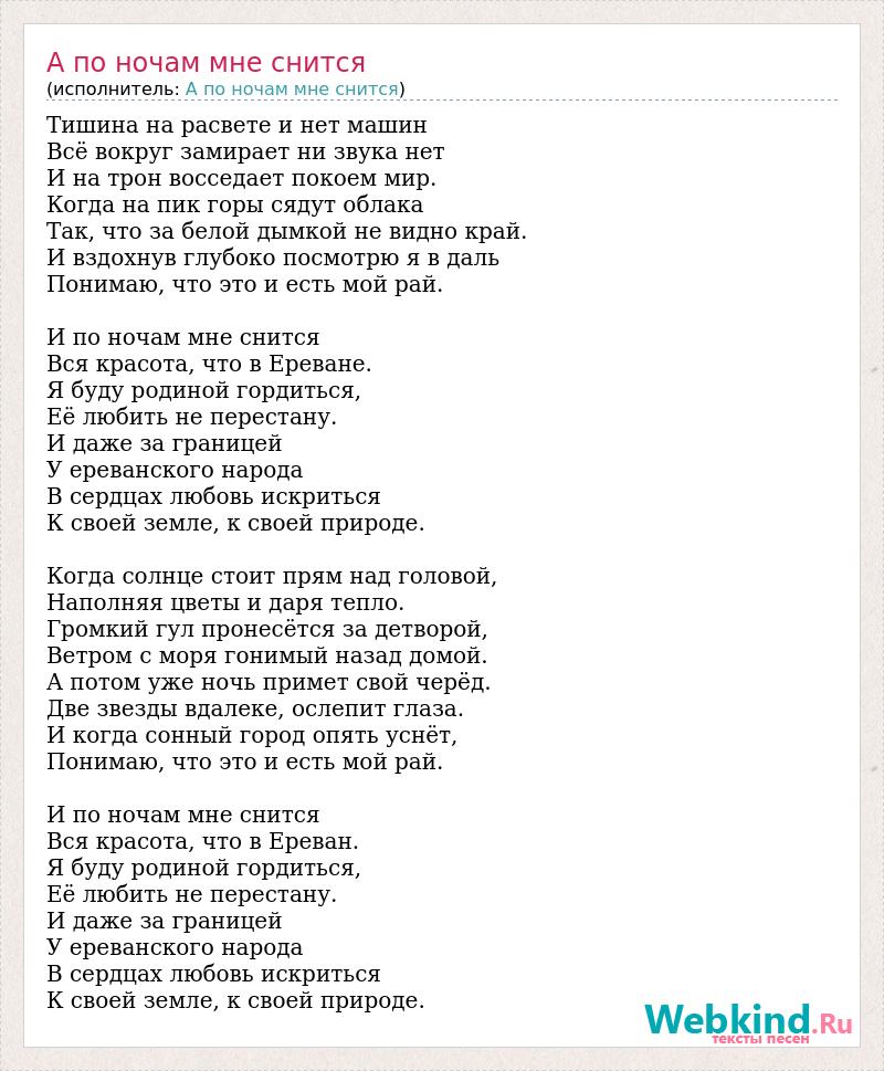 Тишина на расвете и нет машин Всё вокруг замирает ни звука нет И на трон восседает покоем мир. Когда на пик горы сядут облака Так, что за белой дымкой не видно край. И вздохнув глубоко посмотрю я в даль Понимаю, что это и есть мой рай. И по ночам мне снится Вся красота, что в Ереване. Я буду родиной гордиться, Её любить не перестану. И даже за границей У ереванского народа В сердцах любовь искриться К своей земле, к своей природе. Когда солнце стоит прям над головой, Наполняя цветы и даря тепло. Громкий гул пронесётся за детворой, Ветром с моря гонимый назад домой. А потом уже ночь примет свой черёд. Две звезды вдалеке, ослепит глаза. И когда сонный город опять уснёт, Понимаю, что это и есть мой рай. И по ночам мне снится Вся красота, что в Ереван. Я буду родиной гордиться, Её любить не перестану. И даже за границей У ереванского народа В сердцах любовь искриться К своей земле, к своей природе.