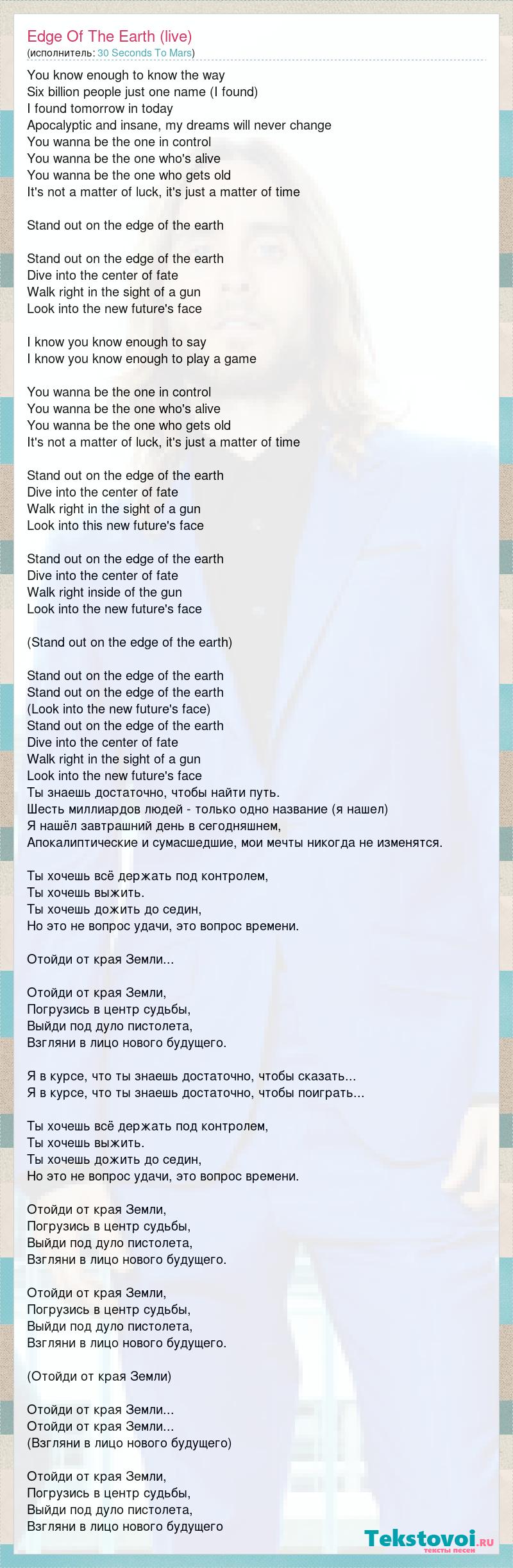 You know enough to know the way Six billion people just one name (I found) I found tomorrow in today Apocalyptic and insane, my dreams will never change You wanna be the one in control You wanna be the one who's alive You wanna be the one who gets old It's not a matter of luck, it's just a matter of time Stand out on the edge of the earth Stand out on the edge of the earth Dive into the center of fate Walk right in the sight of a gun Look into the new future's face I know you know enough to say I know you know enough to play a game You wanna be the one in control You wanna be the one who's alive You wanna be the one who gets old It's not a matter of luck, it's just a matter of time Stand out on the edge of the earth Dive into the center of fate Walk right in the sight of a gun Look into this new future's face Stand out on the edge of the earth Dive into the center of fate Walk right inside of the gun Look into the new future's face (Stand out on the edge of the earth) Stand out on the edge of the earth Stand out on the edge of the earth (Look into the new future's face) Stand out on the edge of the earth Dive into the center of fate Walk right in the sight of a gun Look into the new future's face Ты знаешь достаточно, чтобы найти путь. Шесть миллиардов людей - только одно название (я нашел) Я нашёл завтрашний день в сегодняшнем, Апокалиптические и сумасшедшие, мои мечты никогда не изменятся. Ты хочешь всё держать под контролем, Ты хочешь выжить. Ты хочешь дожить до седин, Но это не вопрос удачи, это вопрос времени. Отойди от края Земли... Отойди от края Земли, Погрузись в центр судьбы, Выйди под дуло пистолета, Взгляни в лицо нового будущего. Я в курсе, что ты знаешь достаточно, чтобы сказать... Я в курсе, что ты знаешь достаточно, чтобы поиграть... Ты хочешь всё держать под контролем, Ты хочешь выжить. Ты хочешь дожить до седин, Но это не вопрос удачи, это вопрос времени. Отойди от края Земли, Погрузись в центр судьбы, Выйди под дуло пистолета, Взгляни в лицо нового будущего. Отойди от края Земли, Погрузись в центр судьбы, Выйди под дуло пистолета, Взгляни в лицо нового будущего. (Отойди от края Земли) Отойди от края Земли... Отойди от края Земли... (Взгляни в лицо нового будущего) Отойди от края Земли, Погрузись в центр судьбы, Выйди под дуло пистолета, Взгляни в лицо нового будущего