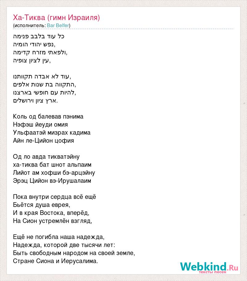 כל עוד בלבב פנימה נפש יהודי הומיה, ולפאתי מזרח קדימה, עין לציון צופיה, עוד לא אבדה תקוותנו, התקווה בת שנות אלפים, להיות עם חופשי בארצנו, ארץ ציון וירושלים. Коль од балевав пэнима Нэфэш йеуди омия Ульфаатэй мизрах кадима Айн ле-Цийон цофия Од ло авда тикватэйну ха-тиква бат шнот альпаим Лийот ам хофши бэ-арцэйну Эрэц Цийон вэ-Ирушалаим Пока внутри сердца всё ещё Бьётся душа еврея, И в края Востока, вперёд, На Сион устремлён взгляд, Ещё не погибла наша надежда, Надежда, которой две тысячи лет: Быть свободным народом на своей земле, Стране Сиона и Иерусалима.