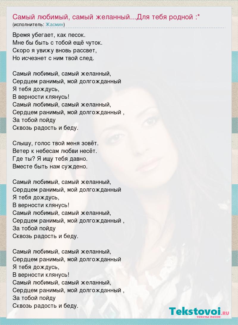 Время убегает, как песок. Мне бы быть с тобой ещё чуток. Скоро я увижу вновь рассвет, Но исчезнет с ним твой след. Самый любимый, самый желанный, Сердцем ранимый, мой долгожданный Я тебя дождусь, В верности клянусь! Самый любимый, самый желанный, Сердцем ранимый, мой долгожданный , За тобой пойду Сквозь радость и беду. Слышу, голос твой меня зовёт. Ветер к небесам любви несёт. Где ты? Я ищу тебя давно. Вместе быть нам суждено. Самый любимый, самый желанный, Сердцем ранимый, мой долгожданный Я тебя дождусь, В верности клянусь! Самый любимый, самый желанный, Сердцем ранимый, мой долгожданный , За тобой пойду Сквозь радость и беду. Самый любимый, самый желанный, Сердцем ранимый, мой долгожданный Я тебя дождусь, В верности клянусь! Самый любимый, самый желанный, Сердцем ранимый, мой долгожданный , За тобой пойду Сквозь радость и беду.