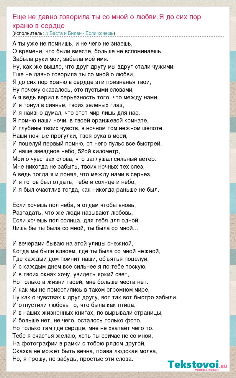 Главная→Исполнители→♫ Баста и Билан - Если хочешь→Еще не давно говорила ты со мной о любви,Я до сих пор храню в сердце