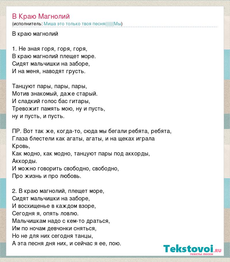 В краю магнолий 1. Не зная горя, горя, горя, В краю магнолий плещет море. Сидят мальчишки на заборе, И на меня, наводят грусть. Танцуют пары, пары, пары, Мотив знакомый, даже старый. И сладкий голос бас гитары, Тревожит память мою, ну и пусть, ну и пусть, и пусть. ПР. Вот так же, когда-то, сюда мы бегали ребята, ребята, Глаза блестели как агаты, агаты, и на щеках играла Кровь, Как модно, как модно, танцуют пары под аккорды, Аккорды. И можно говорить свободно, свободно, Про жизнь и про любовь. 2. В краю магнолий, плещет море, Сидят мальчишки на заборе, И восхищенье в каждом взоре, Сегодня я, опять ловлю. Мальчишкам надо с кем-то драться, Им по ночам девчонки сняться, Но не для них сегодня танцы, А эта песня дня них, и сейчас я ее, пою.