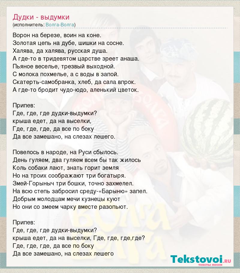 Ворон на березе, воин на коне. Золотая цепь на дубе, шишки на сосне. Халява, да халява, русская душа. А где-то в тридевятом царстве зреет анаша. Пьяное веселье, трезвый выходной. С молока похмелье, а с воды в запой. Скатерть-самобранка, хлеб, да сала впрок. А где-то бродит чудо-юдо, аленький цветок. Припев: Где, где, где дудки-выдумки? крыша едет, да на выселки, Где, где, где, да все по боку Да все замешано, на слезах лешего. Повелось в народе, на Руси сбылось. День гуляем, два гуляем всем бы так жилось Коль собаки лают, знать горит земля Но на троих соображают три богатыря. Змей-Горыныч три бошки, точно захмелел. На всю степь забросил среду-«Барыню» запел. Добрым молодцам мечи кузнецы куют Но они со змеем чарку вместе разопьют. Припев: Где, где, где дудки-выдумки? крыша едет, да на выселки, Где, где, где,где? Где, где, где, да все по боку Да все замешано, на слезах лешего