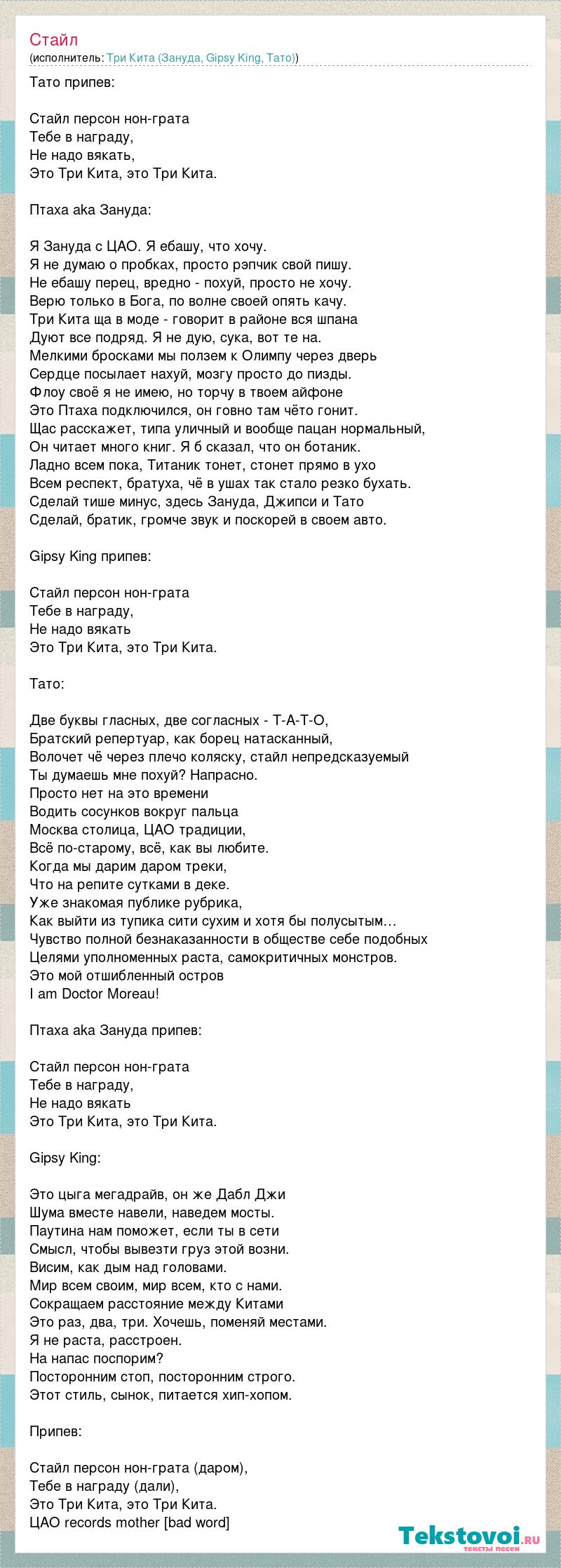 Тато припев: Стайл персон нон-грата Тебе в награду, Не надо вякать, Это Три Кита, это Три Кита. Птаха аkа Зануда: Я Зануда с ЦАО. Я ебашу, что хочу. Я не думаю о пробках, просто рэпчик свой пишу. Не ебашу перец, вредно - похуй, просто не хочу. Верю только в Бога, по волне своей опять качу. Три Кита ща в моде - говорит в районе вся шпана Дуют все подряд. Я не дую, сука, вот те на. Мелкими бросками мы ползем к Олимпу через дверь Сердце посылает нахуй, мозгу просто до пизды. Флоу своё я не имею, но торчу в твоем айфоне Это Птаха подключился, он говно там чёто гонит. Щас расскажет, типа уличный и вообще пацан нормальный, Он читает много книг. Я б сказал, что он ботаник. Ладно всем пока, Титаник тонет, стонет прямо в ухо Всем респект, братуха, чё в ушах так стало резко бухать. Сделай тише минус, здесь Зануда, Джипси и Тато Сделай, братик, громче звук и поскорей в своем авто. Gipsy King припев: Стайл персон нон-грата Тебе в награду, Не надо вякать Это Три Кита, это Три Кита. Тато: Две буквы гласных, две согласных - Т-А-Т-О, Братский репертуар, как борец натасканный, Волочет чё через плечо коляску, стайл непредсказуемый Ты думаешь мне похуй? Напрасно. Просто нет на это времени Водить сосунков вокруг пальца Москва столица, ЦАО традиции, Всё по-старому, всё, как вы любите. Когда мы дарим даром треки, Что на репите сутками в деке. Уже знакомая публике рубрика, Как выйти из тупика сити сухим и хотя бы полусытым… Чувство полной безнаказанности в обществе себе подобных Целями уполноменных раста, самокритичных монстров. Это мой отшибленный остров I am Doctor Moreau! Птаха аkа Зануда припев: Стайл персон нон-грата Тебе в награду, Не надо вякать Это Три Кита, это Три Кита. Gipsy King: Это цыга мегадрайв, он же Дабл Джи Шума вместе навели, наведем мосты. Паутина нам поможет, если ты в сети Смысл, чтобы вывезти груз этой возни. Висим, как дым над головами. Мир всем своим, мир всем, кто с нами. Сокращаем расстояние между Китами Это раз, два, три. Хочешь, поменяй местами. Я не раста, расстроен. На напас поспорим? Посторонним стоп, посторонним строго. Этот стиль, сынок, питается хип-хопом. Припев: Стайл персон нон-грата (даром), Тебе в награду (дали), Это Три Кита, это Три Кита. ЦАО records mother [bad word]