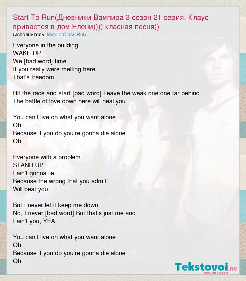 Главная→Исполнители→Middle Class Rut→Start To Run(Дневники Вампира 3 сезон 21 серия, Клаус вриваєтся в дом Ел