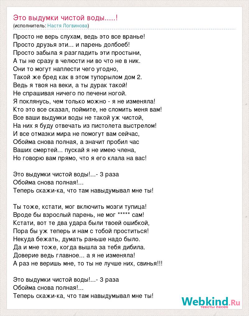 Просто не верь слухам, ведь это все вранье! Просто друзья эти... и парень долбоеб! Просто забыла я разгладить эти простыни, А ты не сразу в челюсти ни во что не в ник. Они то могут наплести чего угодно, Такой же бред как в этом тупорылом дом 2. Ведь я твоя на веки, а ты дурак такой! Не спрашивая ничего по печени ногой. Я поклянусь, чем только можно - я не изменяла! Кто это все сказал, поймите, не сломить меня вам! Все ваши выдумки воды не такой уж чистой, На них я буду отвечать из пистолета выстрелом! И все отмазки мира не помогут вам сейчас, Обойма снова полная, а значит пробил час Ваших смертей... пускай я не имею члена, Но говорю вам прямо, что я его клала на вас! Это выдумки чистой воды!...- 3 раза Обойма снова полная!... Теперь скажи-ка, что там навыдумывал мне ты! Ты тоже, кстати, мог включить мозги тупица! Вроде бы взрослый парень, не мог ***** сам! Кстати, вот те два удара были твоей ошибкой, Пора бы уж теперь и нам с тобой проститься! Некуда бежать, думать раньше надо было. Да и мне тоже, когда вышла за тебя дибила. Доверие ведь главное... а я не изменяла! А раз не веришь мне, то ты не лучше них, свинья!!! Это выдумки чистой воды!...- 3 раза Обойма снова полная!... Теперь скажи-ка, что там навыдумывал мне ты!