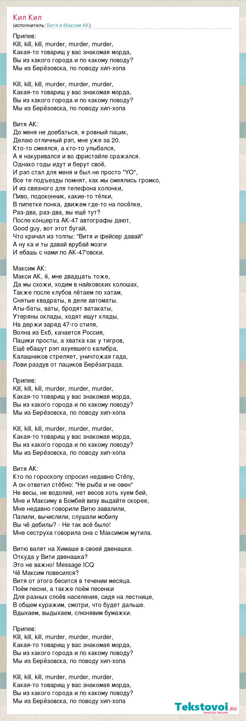 Припев: Kill, kill, kill, murder, murder, murder, Какая-то товарищ у вас знакомая морда, Вы из какого города и по какому поводу? Мы из Берёзовска, по поводу хип-хопа Kill, kill, kill, murder, murder, murder, Какая-то товарищ у вас знакомая морда, Вы из какого города и по какому поводу? Мы из Берёзовска, по поводу хип-хопа Витя АК: До меня не доебаться, я ровный пацик, Делаю отличный рэп, мне уже за 20. Кто-то смеялся, а кто-то улыбался, А я накуривался и во фристайле сражался. Однако годы идут и берут своё, И рэп стал для меня и был не просто "YO", Все те подъезды помнят, как мы смеялись громко, И из связного для телефона колонки, Пиво, подоконник, какие-то тёлки, В пипетке понка, движем где-то на посёлке, Раз-два, раз-два, вы ещё тут? После концерта АК-47 автографы дают, Good guy, вот этот бугай, Что кричал из толпы: "Витя и фейсер давай" А ну ка и ты давай врубай мозги И ебашь с нами по АК-47'овски. Максим АК: Макси АК, ё, мне двадцать тоже, Да мы схожи, ходим в найковских колошах, Также после клубов лётаем по хатам, Снятые квадраты, в деле автоматы. Аты-баты, ваты, бродят ватакаты, Утеряны оклады, ходят ищут клады, На держи заряд 47-го стиля, Волна из Екб, качается Россия, Пацики просты, а хватка как у тигров, Ещё ебашут рэп ахуевшего калибра, Калашников стреляет, уничтожая гада, Лови раздув от пациков Берёзаграда. Припев: Kill, kill, kill, murder, murder, murder, Какая-то товарищ у вас знакомая морда, Вы из какого города и по какому поводу? Мы из Берёзовска, по поводу хип-хопа Kill, kill, kill, murder, murder, murder, Какая-то товарищ у вас знакомая морда, Вы из какого города и по какому поводу? Мы из Берёзовска, по поводу хип-хопа Витя АК: Кто по гороскопу спросил недавно Стёпу, А он ответил стёбно: "Не рыба и не овен" Не весы, не водолей, нет весов хоть хуем бей, Мне и Максиму в Бомбей визу выдайте скорее, Мне недавно говорили Витю завалили, Палили, вычислили, слушали мобилу Вы чё дебилы? - Не так всё было! Мне сеструха говорила она с Максимом мутила. Витю валят на Химаше в своей двенашке. Откуда у Вити двенашка? Это не важно! Message ICQ Чё Максим повесился? Витя от этого бесится в течении месяца. Поём песни, а также поём песенки Для разных слоёв населения, сидя на лестнице, В общем куражим, смотри, что будет дальше. Вдыхаем, выдыхаем, слюнявим бумажки. Припев: Kill, kill, kill, murder, murder, murder, Какая-то товарищ у вас знакомая морда, Вы из какого города и по какому поводу? Мы из Берёзовска, по поводу хип-хопа Kill, kill, kill, murder, murder, murder, Какая-то товарищ у вас знакомая морда, Вы из какого города и по какому поводу? Мы из Берёзовска, по поводу хип-хопа