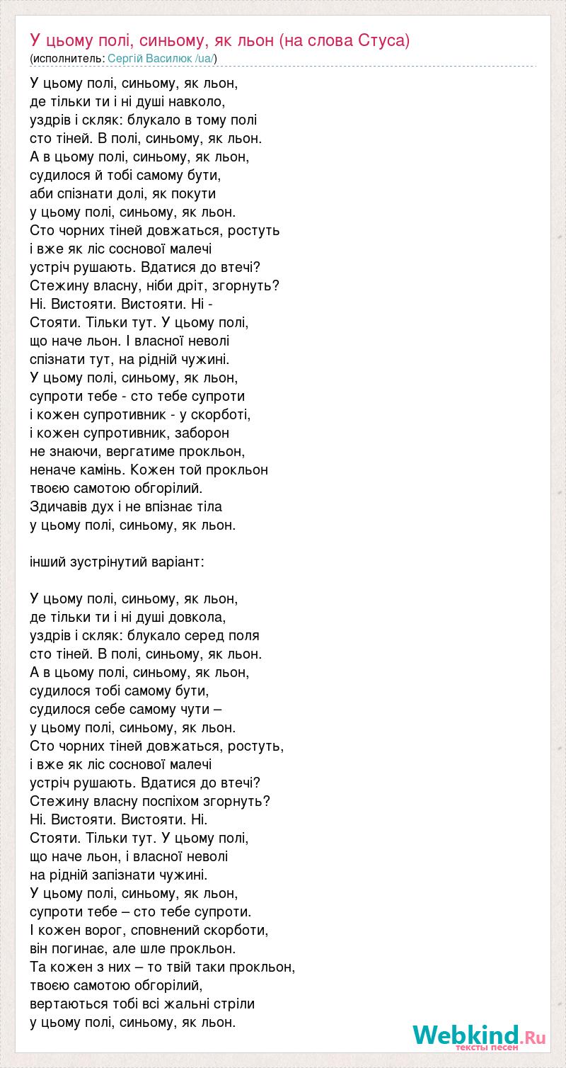 У цьому полі, синьому, як льон, де тільки ти і ні душі навколо, уздрів і скляк: блукало в тому полі сто тіней. В полі, синьому, як льон. А в цьому полі, синьому, як льон, судилося й тобі самому бути, аби спізнати долі, як покути у цьому полі, синьому, як льон. Сто чорних тіней довжаться, ростуть і вже як ліс соснової малечі устріч рушають. Вдатися до втечі? Стежину власну, ніби дріт, згорнуть? Ні. Вистояти. Вистояти. Ні - Стояти. Тільки тут. У цьому полі, що наче льон. І власної неволі спізнати тут, на рідній чужині. У цьому полі, синьому, як льон, супроти тебе - сто тебе супроти і кожен супротивник - у скорботі, і кожен супротивник, заборон не знаючи, вергатиме прокльон, неначе камінь. Кожен той прокльон твоєю самотою обгорілий. Здичавів дух і не впізнає тіла у цьому полі, синьому, як льон. інший зустрінутий варіант: У цьому полі, синьому, як льон, де тільки ти і ні душі довкола, уздрів і скляк: блукало серед поля сто тіней. В полі, синьому, як льон. А в цьому полі, синьому, як льон, судилося тобі самому бути, судилося себе самому чути – у цьому полі, синьому, як льон. Сто чорних тіней довжаться, ростуть, і вже як ліс соснової малечі устріч рушають. Вдатися до втечі? Стежину власну поспіхом згорнуть? Ні. Вистояти. Вистояти. Ні. Стояти. Тільки тут. У цьому полі, що наче льон, і власної неволі на рідній запізнати чужині. У цьому полі, синьому, як льон, супроти тебе – сто тебе супроти. І кожен ворог, сповнений скорботи, він погинає, але шле прокльон. Та кожен з них – то твій таки прокльон, твоєю самотою обгорілий, вертаються тобі всі жальні стріли у цьому полі, синьому, як льон.