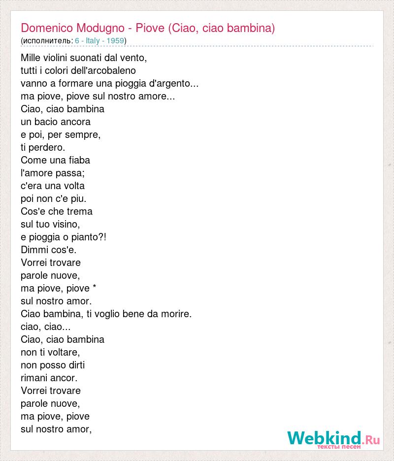 Mille violini suonati dal vento, tutti i colori dell'arcobaleno vanno a formare una pioggia d'argento... ma piove, piove sul nostro amore... Ciao, ciao bambina un bacio ancora e poi, per sempre, ti perdero. Come una fiaba l'amore passa; c'era una volta poi non c'e piu. Cos'e che trema sul tuo visino, e pioggia o pianto?! Dimmi cos'e. Vorrei trovare parole nuove, ma piove, piove * sul nostro amor. Ciao bambina, ti voglio bene da morire. ciao, ciao... Ciao, ciao bambina non ti voltare, non posso dirti rimani ancor. Vorrei trovare parole nuove, ma piove, piove sul nostro amor,
