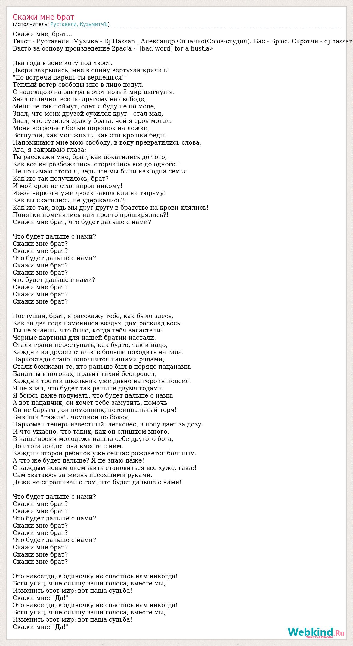 Скажи мне, брат... Текст - Руставели. Музыка - Dj Hassan , Александр Оплачко(Союз-студия). Бас - Брюс. Скрэтчи - dj hassan Взято за основу произведение 2pac'а - [bad word] for a hustla» Два года в зоне коту под хвост. Двери закрылись, мне в спину вертухай кричал: "До встречи парень ты вернешься!" Теплый ветер свободы мне в лицо подул. С надеждою на завтра в этот новый мир шагнул я. Знал отлично: все по другому на свободе, Меня не так поймут, одет я буду не по моде, Знал, что моих друзей сузился круг - стал мал, Знал, что сузился зрак у брата, чей я срок мотал. Меня встречает белый порошок на ложке, Вогнутой, как моя жизнь, как эти крошки беды, Напоминают мне мою свободу, в воду превратились слова, Ага, я закрываю глаза: Ты расскажи мне, брат, как докатились до того, Как все вы разбежались, сторчались все до одного? Не понимаю этого я, ведь все мы были как одна семья. Как же так получилось, брат? И мой срок не стал впрок никому! Из-за наркоты уже двоих заволокли на тюрьму! Как вы скатились, не удержались?! Как же так, ведь мы друг другу в братстве на крови клялись! Понятки поменялись или просто проширялись?! Скажи мне брат, что будет дальше с нами? Что будет дальше с нами? Скажи мне брат? Скажи мне брат? Что будет дальше с нами? Скажи мне брат? Скажи мне брат? что будет дальше с нами? Скажи мне брат? Скажи мне брат? Скажи мне брат? Послушай, брат, я расскажу тебе, как было здесь, Как за два года изменился воздух, дам расклад весь. Ты не знаешь, что было, когда тебя заластали: Черные картины для нашей братии настали. Стали грани переступать, как будто, так и надо, Каждый из друзей стал все больше походить на гада. Наркостадо стало пополнятся нашими рядами, Стали бомжами те, кто раньше был в поряде пацанами. Бандиты в погонах, правит тихий беспредел, Каждый третий школьник уже давно на героин подсел. Я не знал, что будет так раньше двумя годами, Я боюсь даже подумать, что будет дальше с нами. А вот пацанчик, он хочет тебе замутить, помочь Он не барыга , он помощник, потенциальный торч! Бывший "тяжик": чемпион по боксу, Наркоман теперь известный, легковес, в попу дает за дозу. И что ужасно, что таких, как он слишком много. В наше время молодежь нашла себе другого бога, До итога дойдет она вместе с ним. Каждый второй ребенок уже сейчас рождается больным. А что же будет дальше? Я не знаю даже! С каждым новым днем жить становиться все хуже, гаже! Сам хватаюсь за жизнь иссохшими руками. Даже не спрашивай о том, что будет дальше с нами! Что будет дальше с нами? Скажи мне брат? Скажи мне брат? Что будет дальше с нами? Скажи мне брат? Скажи мне брат? Что будет дальше с нами? Скажи мне брат? Скажи мне брат? Скажи мне брат? Это навсегда, в одиночку не спастись нам никогда! Боги улиц, я не слышу ваши голоса, вместе мы, Изменить этот мир: вот наша судьба! Скажи мне: "Да!" Это навсегда, в одиночку не спастись нам никогда! Боги улиц, я не слышу ваши голоса, вместе мы, Изменить этот мир: вот наша судьба! Скажи мне: "Да!"