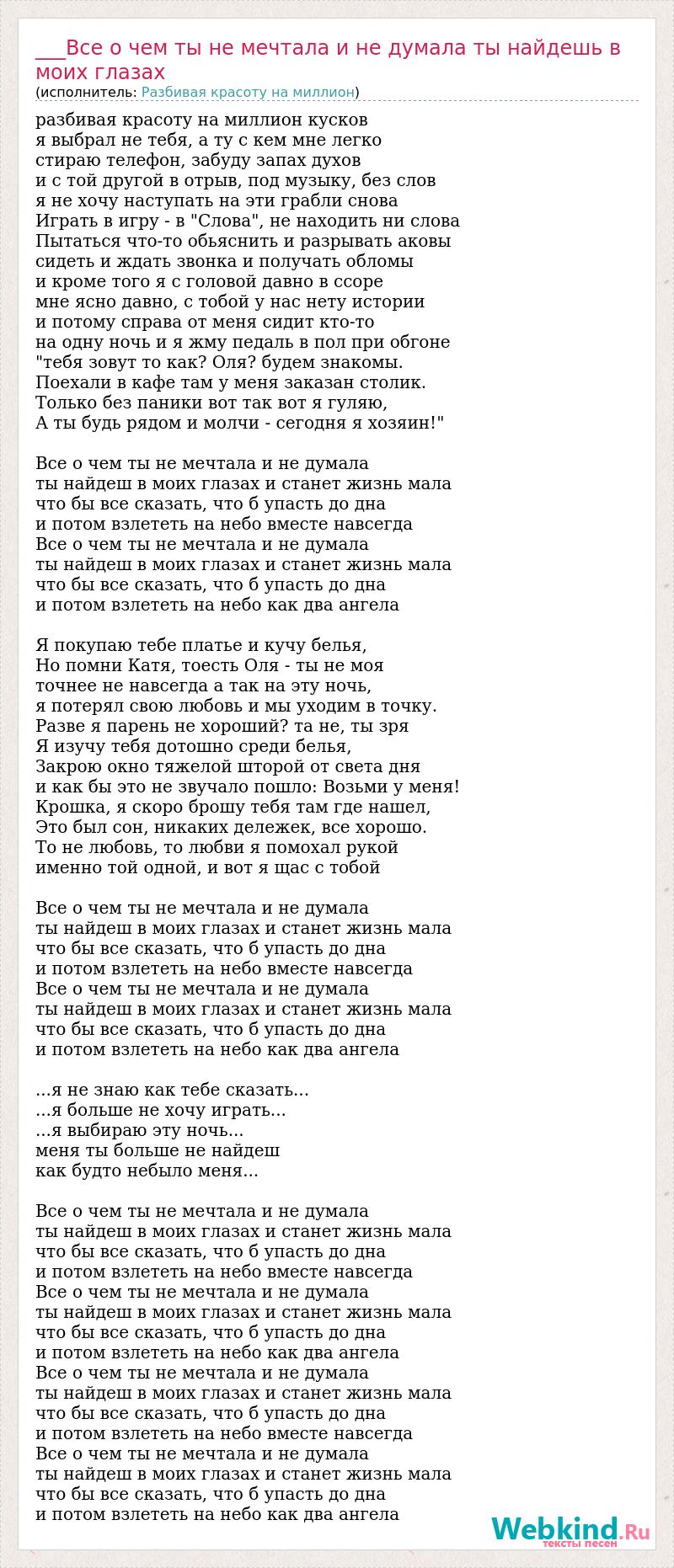 Главная→Исполнители→Разбивая красоту на миллион→___Все о чем ты не мечтала и не думала ты найдешь в моих глазах
