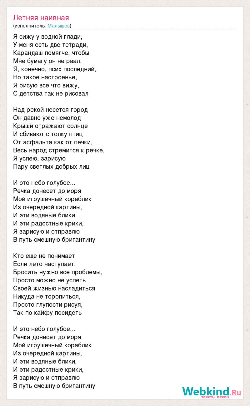 Я сижу у водной глади, У меня есть две тетради, Карандаш помягче, чтобы Мне бумагу он не рвал. Я, конечно, псих последний, Но такое настроенье, Я рисую все что вижу, С детства так не рисовал Над рекой несется город Он давно уже немолод Крыши отражают солнце И сбивают с толку птиц От асфальта как от печки, Весь народ стремится к речке, Я успею, зарисую Пару светлых добрых лиц И это небо голубое... Речка донесет до моря Мой игрушечный кораблик Из очередной картины, И эти водяные блики, И эти радостные крики, Я зарисую и отправлю В путь смешную бригантину Кто еще не понимает Если лето наступает, Бросить нужно все проблемы, Просто можно не успеть Своей жизнью насладиться Никуда не торопиться, Просто глупости рисуя, Так по кайфу посидеть И это небо голубое... Речка донесет до моря Мой игрушечный кораблик Из очередной картины, И эти водяные блики, И эти радостные крики, Я зарисую и отправлю В путь смешную бригантину