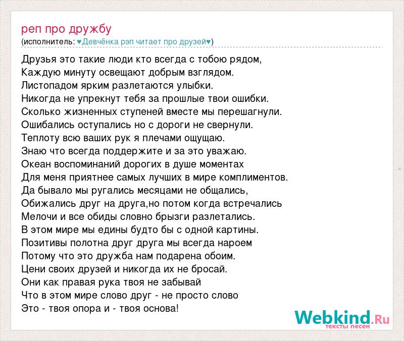 Друзья это такие люди кто всегда с тобою рядом, Каждую минуту освещают добрым взглядом. Листопадом ярким разлетаются улыбки. Никогда не упрекнут тебя за прошлые твои ошибки. Сколько жизненных ступеней вместе мы перешагнули. Ошибались оступались но с дороги не свернули. Теплоту всю ваших рук я плечами ощущаю. Знаю что всегда поддержите и за это уважаю. Океан воспоминаний дорогих в душе моментах Для меня приятнее самых лучших в мире комплиментов. Да бывало мы ругались месяцами не общались, Обижались друг на друга,но потом когда встречались Мелочи и все обиды словно брызги разлетались. В этом мире мы едины будто бы с одной картины. Позитивы полотна друг друга мы всегда нароем Потому что это дружба нам подарена обоим. Цени своих друзей и никогда их не бросай. Они как правая рука твоя не забывай Что в этом мире слово друг - не просто слово Это - твоя опора и - твоя основа!