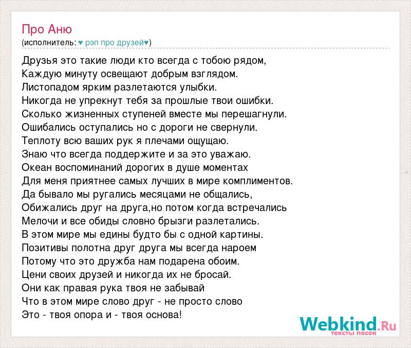 Друзья это такие люди кто всегда с тобою рядом, Каждую минуту освещают добрым взглядом. Листопадом ярким разлетаются улыбки. Никогда не упрекнут тебя за прошлые твои ошибки. Сколько жизненных ступеней вместе мы перешагнули. Ошибались оступались но с дороги не свернули. Теплоту всю ваших рук я плечами ощущаю. Знаю что всегда поддержите и за это уважаю. Океан воспоминаний дорогих в душе моментах Для меня приятнее самых лучших в мире комплиментов. Да бывало мы ругались месяцами не общались, Обижались друг на друга,но потом когда встречались Мелочи и все обиды словно брызги разлетались. В этом мире мы едины будто бы с одной картины. Позитивы полотна друг друга мы всегда нароем Потому что это дружба нам подарена обоим. Цени своих друзей и никогда их не бросай. Они как правая рука твоя не забывай Что в этом мире слово друг - не просто слово Это - твоя опора и - твоя основа!