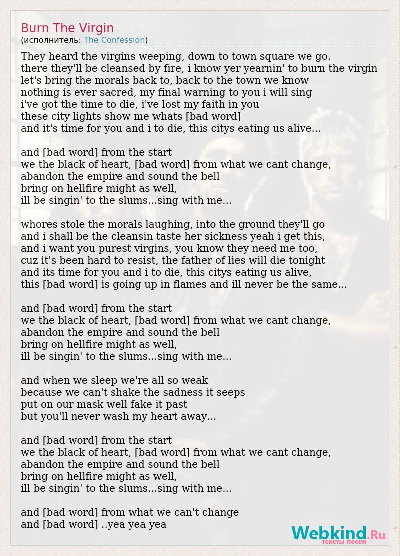 They heard the virgins weeping, down to town square we go. there they'll be cleansed by fire, i know yer yearnin' to burn the virgin let's bring the morals back to, back to the town we know nothing is ever sacred, my final warning to you i will sing i've got the time to die, i've lost my faith in you these city lights show me whats [bad word] and it's time for you and i to die, this citys eating us alive... and [bad word] from the start we the black of heart, [bad word] from what we cant change, abandon the empire and sound the bell bring on hellfire might as well, ill be singin' to the slums...sing with me... whores stole the morals laughing, into the ground they'll go and i shall be the cleansin taste her sickness yeah i get this, and i want you purest virgins, you know they need me too, cuz it's been hard to resist, the father of lies will die tonight and its time for you and i to die, this citys eating us alive, this [bad word] is going up in flames and ill never be the same... and [bad word] from the start we the black of heart, [bad word] from what we cant change, abandon the empire and sound the bell bring on hellfire might as well, ill be singin' to the slums...sing with me... and when we sleep we're all so weak because we can't shake the sadness it seeps put on our mask well fake it past but you'll never wash my heart away... and [bad word] from the start we the black of heart, [bad word] from what we cant change, abandon the empire and sound the bell bring on hellfire might as well, ill be singin' to the slums...sing with me... and [bad word] from what we can't change and [bad word] ..yea yea yea
