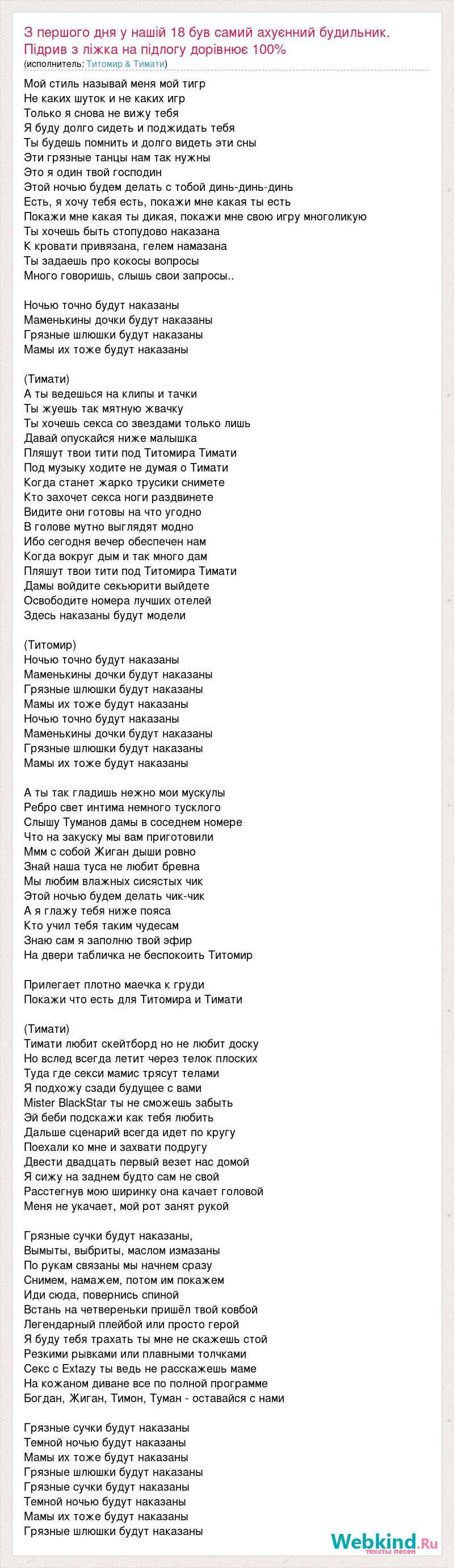 Мой стиль называй меня мой тигр Не каких шуток и не каких игр Только я снова не вижу тебя Я буду долго сидеть и поджидать тебя Ты будешь помнить и долго видеть эти сны Эти грязные танцы нам так нужны Это я один твой господин Этой ночью будем делать с тобой динь-динь-динь Есть, я хочу тебя есть, покажи мне какая ты есть Покажи мне какая ты дикая, покажи мне свою игру многоликую Ты хочешь быть стопудово наказана К кровати привязана, гелем намазана Ты задаешь про кокосы вопросы Много говоришь, слышь свои запросы.. Ночью точно будут наказаны Маменькины дочки будут наказаны Грязные шлюшки будут наказаны Мамы их тоже будут наказаны (Тимати) А ты ведешься на клипы и тачки Ты жуешь так мятную жвачку Ты хочешь секса со звездами только лишь Давай опускайся ниже малышка Пляшут твои тити под Титомира Тимати Под музыку ходите не думая о Тимати Когда станет жарко трусики снимете Кто захочет секса ноги раздвинете Видите они готовы на что угодно В голове мутно выглядят модно Ибо сегодня вечер обеспечен нам Когда вокруг дым и так много дам Пляшут твои тити под Титомира Тимати Дамы войдите секьюрити выйдете Освободите номера лучших отелей Здесь наказаны будут модели (Титомир) Ночью точно будут наказаны Маменькины дочки будут наказаны Грязные шлюшки будут наказаны Мамы их тоже будут наказаны Ночью точно будут наказаны Маменькины дочки будут наказаны Грязные шлюшки будут наказаны Мамы их тоже будут наказаны А ты так гладишь нежно мои мускулы Ребро свет интима немного тусклого Слышу Туманов дамы в соседнем номере Что на закуску мы вам приготовили Ммм с собой Жиган дыши ровно Знай наша туса не любит бревна Мы любим влажных сисястых чик Этой ночью будем делать чик-чик А я глажу тебя ниже пояса Кто учил тебя таким чудесам Знаю сам я заполню твой эфир На двери табличка не беспокоить Титомир Прилегает плотно маечка к груди Покажи что есть для Титомира и Тимати (Тимати) Тимати любит скейтборд но не любит доску Но вслед всегда летит через телок плоских Туда где секси мамис трясут телами Я подхожу сзади будущее с вами Mister BlackStar ты не сможешь забыть Эй беби подскажи как тебя любить Дальше сценарий всегда идет по кругу Поехали ко мне и захвати подругу Двести двадцать первый везет нас домой Я сижу на заднем будто сам не свой Расстегнув мою ширинку она качает головой Меня не укачает, мой рот занят рукой Грязные сучки будут наказаны, Вымыты, выбриты, маслом измазаны По рукам связаны мы начнем сразу Снимем, намажем, потом им покажем Иди сюда, повернись спиной Встань на четвереньки пришёл твой ковбой Легендарный плейбой или просто герой Я буду тебя трахать ты мне не скажешь стой Резкими рывками или плавными толчками Секс с Extazy ты ведь не расскажешь маме На кожаном диване все по полной программе Богдан, Жиган, Тимон, Туман - оставайся с нами Грязные сучки будут наказаны Темной ночью будут наказаны Мамы их тоже будут наказаны Грязные шлюшки будут наказаны Грязные сучки будут наказаны Темной ночью будут наказаны Мамы их тоже будут наказаны Грязные шлюшки будут наказаны