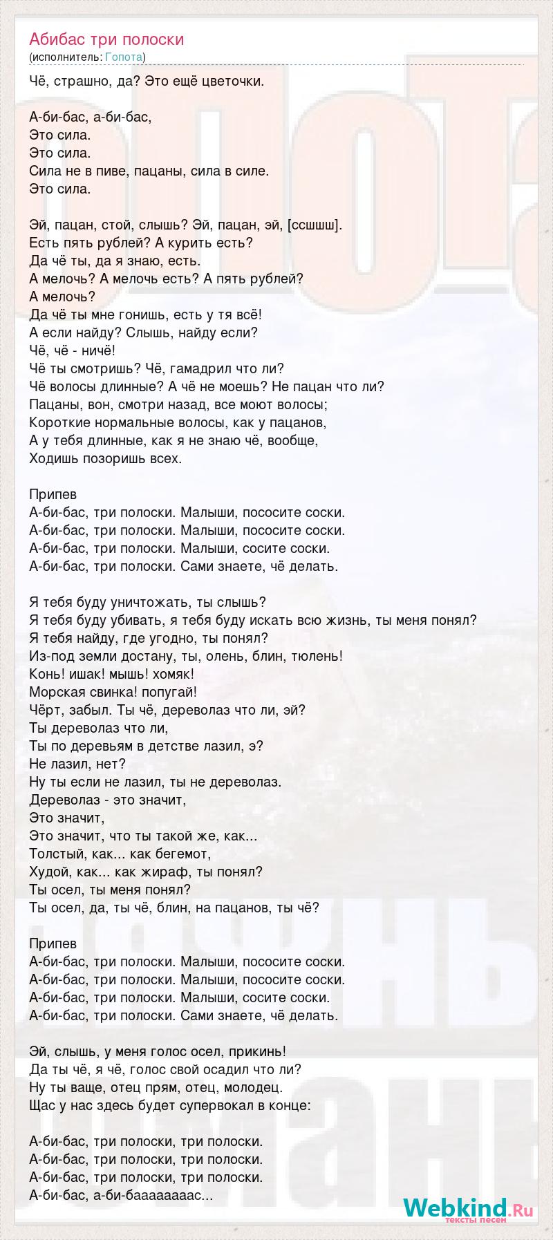 Чё, страшно, да? Это ещё цветочки. А-би-бас, а-би-бас, Это сила. Это сила. Сила не в пиве, пацаны, сила в силе. Это сила. Эй, пацан, стой, слышь? Эй, пацан, эй, [ссшшш]. Есть пять рублей? А курить есть? Да чё ты, да я знаю, есть. А мелочь? А мелочь есть? А пять рублей? А мелочь? Да чё ты мне гонишь, есть у тя всё! А если найду? Слышь, найду если? Чё, чё - ничё! Чё ты смотришь? Чё, гамадрил что ли? Чё волосы длинные? А чё не моешь? Не пацан что ли? Пацаны, вон, смотри назад, все моют волосы; Короткие нормальные волосы, как у пацанов, А у тебя длинные, как я не знаю чё, вообще, Ходишь позоришь всех. Припев А-би-бас, три полоски. Малыши, пососите соски. А-би-бас, три полоски. Малыши, пососите соски. А-би-бас, три полоски. Малыши, сосите соски. А-би-бас, три полоски. Сами знаете, чё делать. Я тебя буду уничтожать, ты слышь? Я тебя буду убивать, я тебя буду искать всю жизнь, ты меня понял? Я тебя найду, где угодно, ты понял? Из-под земли достану, ты, олень, блин, тюлень! Конь! ишак! мышь! хомяк! Морская свинка! попугай! Чёрт, забыл. Ты чё, дереволаз что ли, эй? Ты дереволаз что ли, Ты по деревьям в детстве лазил, э? Не лазил, нет? Ну ты если не лазил, ты не дереволаз. Дереволаз - это значит, Это значит, Это значит, что ты такой же, как... Толстый, как... как бегемот, Худой, как... как жираф, ты понял? Ты осел, ты меня понял? Ты осел, да, ты чё, блин, на пацанов, ты чё? Припев А-би-бас, три полоски. Малыши, пососите соски. А-би-бас, три полоски. Малыши, пососите соски. А-би-бас, три полоски. Малыши, сосите соски. А-би-бас, три полоски. Сами знаете, чё делать. Эй, слышь, у меня голос осел, прикинь! Да ты чё, я чё, голос свой осадил что ли? Ну ты ваще, отец прям, отец, молодец. Щас у нас здесь будет супервокал в конце: А-би-бас, три полоски, три полоски. А-би-бас, три полоски, три полоски. А-би-бас, три полоски, три полоски. А-би-бас, а-би-баааааааас...