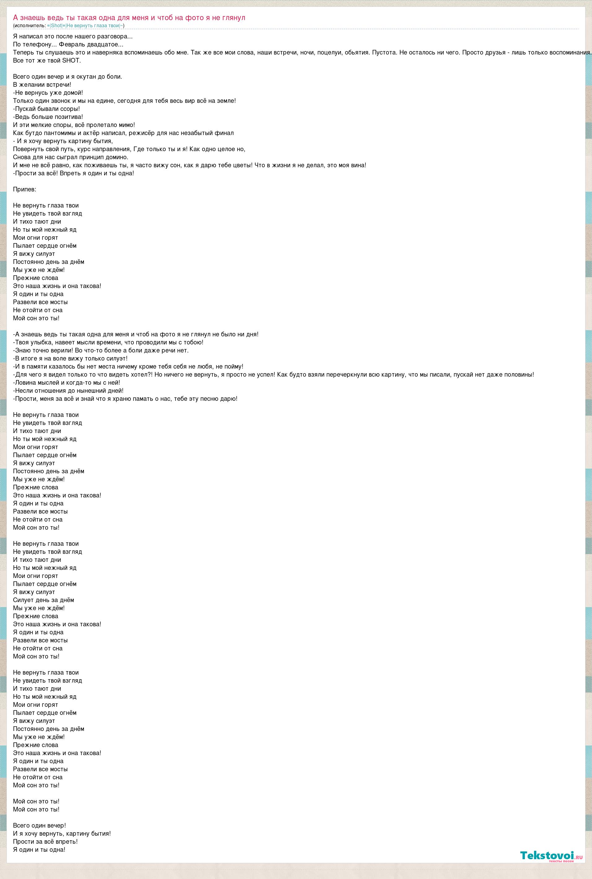 Я написал это после нашего разговора... По телефону... Февраль двадцатое... Теперь ты слушаешь это и наверняка вспоминаешь обо мне. Так же все мои слова, наши встречи, ночи, поцелуи, обьятия. Пустота. Не осталось ни чего. Просто друзья - лишь только воспоминания. Все тот же твой SHOT. Всего один вечер и я окутан до боли. В желании встречи! -Не вернусь уже домой! Только один звонок и мы на едине, сегодня для тебя весь вир всё на земле! -Пускай бывали ссоры! -Ведь больше позитива! И эти мелкие споры, всё пролетало мимо! Как бутдо пантомимы и актёр написал, режисёр для нас незабытый финал - И я хочу вернуть картину бытия, Повернуть свой путь, курс направления, Где только ты и я! Как одно целое но, Снова для нас сыграл принцип домино. И мне не всё равно, как поживаешь ты, я часто вижу сон, как я дарю тебе цветы! Что в жизни я не делал, это моя вина! -Прости за всё! Впреть я один и ты одна! Припев: Не вернуть глаза твои Не увидеть твой взгляд И тихо тают дни Но ты мой нежный яд Мои огни горят Пылает сердце огнём Я вижу силуэт Постоянно день за днём Мы уже не ждём! Прежние слова Это наша жизнь и она такова! Я один и ты одна Развели все мосты Не отойти от сна Мой сон это ты! -А знаешь ведь ты такая одна для меня и чтоб на фото я не глянул не было ни дня! -Твоя улыбка, навеет мысли времени, что проводили мы с тобою! -Знаю точно верили! Во что-то более а боли даже речи нет. -В итоге я на воле вижу только силуэт! -И в памяти казалось бы нет места ничему кроме тебя себя не любя, не пойму! -Для чего я видел только то что видеть хотел?! Но ничего не вернуть, я просто не успел! Как будто взяли перечеркнули всю картину, что мы писали, пускай нет даже половины! -Ловина мыслей и когда-то мы с ней! -Несли отношения до нынешний дней! -Прости, меня за всё и знай что я храню памать о нас, тебе эту песню дарю! Не вернуть глаза твои Не увидеть твой взгляд И тихо тают дни Но ты мой нежный яд Мои огни горят Пылает сердце огнём Я вижу силуэт Постоянно день за днём Мы уже не ждём! Прежние слова Это наша жизнь и она такова! Я один и ты одна Развели все мосты Не отойти от сна Мой сон это ты! Не вернуть глаза твои Не увидеть твой взгляд И тихо тают дни Но ты мой нежный яд Мои огни горят Пылает сердце огнём Я вижу силуэт Силует день за днём Мы уже не ждём! Прежние слова Это наша жизнь и она такова! Я один и ты одна Развели все мосты Не отойти от сна Мой сон это ты! Не вернуть глаза твои Не увидеть твой взгляд И тихо тают дни Но ты мой нежный яд Мои огни горят Пылает сердце огнём Я вижу силуэт Постоянно день за днём Мы уже не ждём! Прежние слова Это наша жизнь и она такова! Я один и ты одна Развели все мосты Не отойти от сна Мой сон это ты! Мой сон это ты! Мой сон это ты! Всего один вечер! И я хочу вернуть, картину бытия! Прости за всё впреть! Я один и ты одна!