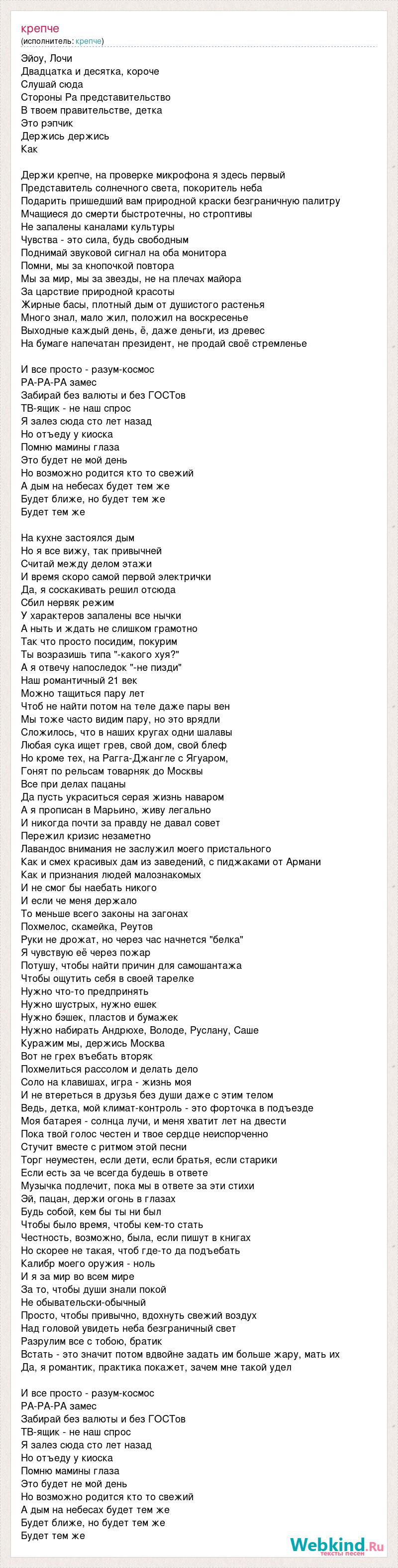 Эйоу, Лочи Двадцатка и десятка, короче Слушай сюда Стороны Ра представительство В твоем правительстве, детка Это рэпчик Держись держись Как Держи крепче, на проверке микрофона я здесь первый Представитель солнечного света, покоритель неба Подарить пришедший вам природной краски безграничную палитру Мчащиеся до смерти быстротечны, но строптивы Не запалены каналами культуры Чувства - это сила, будь свободным Поднимай звуковой сигнал на оба монитора Помни, мы за кнопочкой повтора Мы за мир, мы за звезды, не на плечах майора За царствие природной красоты Жирные басы, плотный дым от душистого растенья Много знал, мало жил, положил на воскресенье Выходные каждый день, ё, даже деньги, из древес На бумаге напечатан президент, не продай своё стремленье И все просто - разум-космос РА-РА-РА замес Забирай без валюты и без ГОСТов ТВ-ящик - не наш спрос Я залез сюда сто лет назад Но отъеду у киоска Помню мамины глаза Это будет не мой день Но возможно родится кто то свежий А дым на небесах будет тем же Будет ближе, но будет тем же Будет тем же На кухне застоялся дым Но я все вижу, так привычней Считай между делом этажи И время скоро самой первой электрички Да, я соскакивать решил отсюда Сбил нервяк режим У характеров запалены все нычки А ныть и ждать не слишком грамотно Так что просто посидим, покурим Ты возразишь типа "-какого хуя?" А я отвечу напоследок "-не пизди" Наш романтичный 21 век Можно тащиться пару лет Чтоб не найти потом на теле даже пары вен Мы тоже часто видим пару, но это врядли Сложилось, что в наших кругах одни шалавы Любая сука ищет грев, свой дом, свой блеф Но кроме тех, на Рагга-Джангле с Ягуаром, Гонят по рельсам товарняк до Москвы Все при делах пацаны Да пусть украситься серая жизнь наваром А я прописан в Марьино, живу легально И никогда почти за правду не давал совет Пережил кризис незаметно Лавандос внимания не заслужил моего пристального Как и смех красивых дам из заведений, с пиджаками от Армани Как и признания людей малознакомых И не смог бы наебать никого И если че меня держало То меньше всего законы на загонах Похмелос, скамейка, Реутов Руки не дрожат, но через час начнется "белка" Я чувствую её через пожар Потушу, чтобы найти причин для самошантажа Чтобы ощутить себя в своей тарелке Нужно что-то предпринять Нужно шустрых, нужно ешек Нужно бэшек, пластов и бумажек Нужно набирать Андрюхе, Володе, Руслану, Саше Куражим мы, держись Москва Вот не грех въебать вторяк Похмелиться рассолом и делать дело Соло на клавишах, игра - жизнь моя И не втереться в друзья без души даже с этим телом Ведь, детка, мой климат-контроль - это форточка в подъезде Моя батарея - солнца лучи, и меня хватит лет на двести Пока твой голос честен и твое сердце неиспорченно Стучит вместе с ритмом этой песни Торг неуместен, если дети, если братья, если старики Если есть за че всегда будешь в ответе Музычка подлечит, пока мы в ответе за эти стихи Эй, пацан, держи огонь в глазах Будь собой, кем бы ты ни был Чтобы было время, чтобы кем-то стать Честность, возможно, была, если пишут в книгах Но скорее не такая, чтоб где-то да подъебать Калибр моего оружия - ноль И я за мир во всем мире За то, чтобы души знали покой Не обывательски-обычный Просто, чтобы привычно, вдохнуть свежий воздух Над головой увидеть неба безграничный свет Разрулим все с тобою, братик Встать - это значит потом вдвой