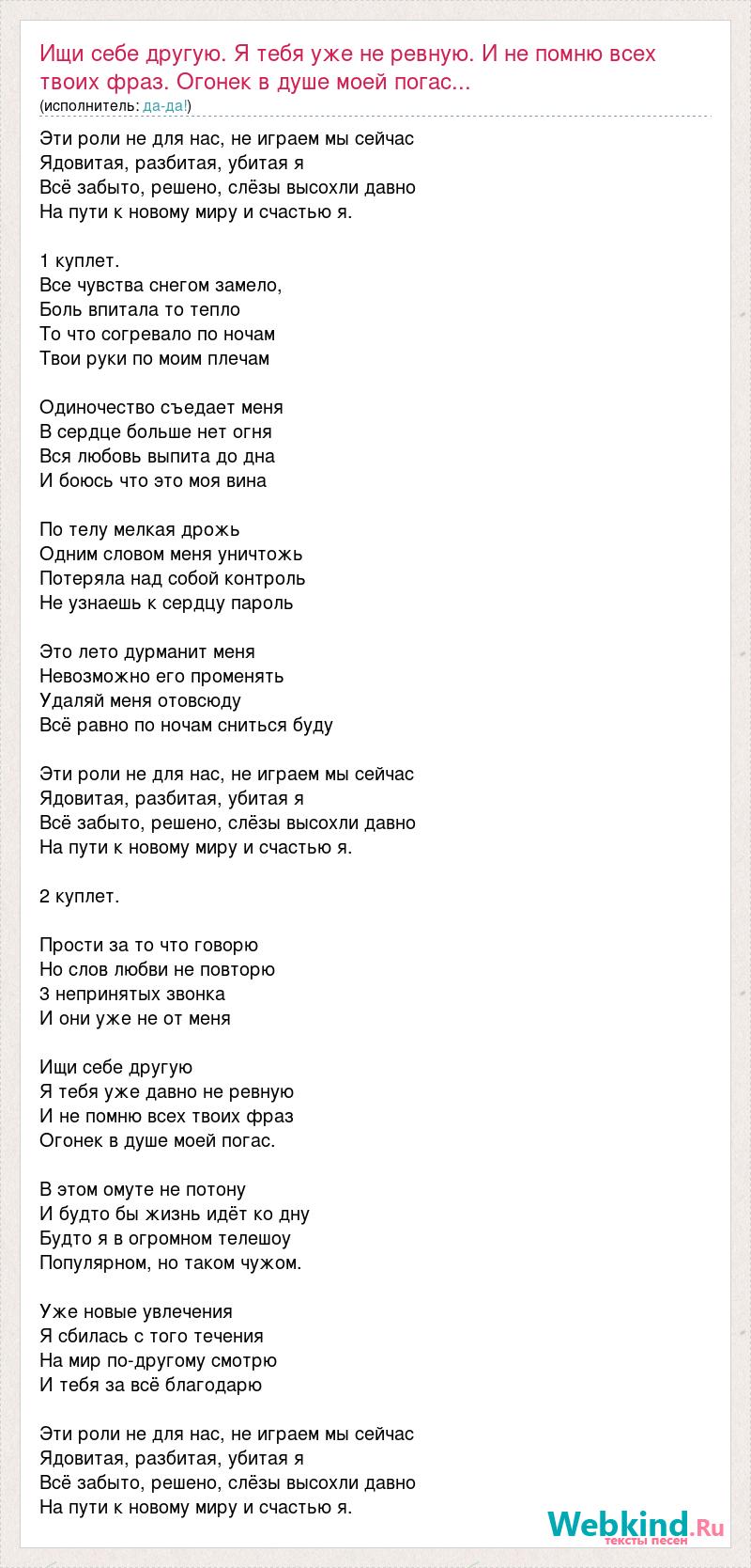 Эти роли не для нас, не играем мы сейчас Ядовитая, разбитая, убитая я Всё забыто, решено, слёзы высохли давно На пути к новому миру и счастью я. 1 куплет. Все чувства снегом замело, Боль впитала то тепло То что согревало по ночам Твои руки по моим плечам Одиночество съедает меня В сердце больше нет огня Вся любовь выпита до дна И боюсь что это моя вина По телу мелкая дрожь Одним словом меня уничтожь Потеряла над собой контроль Не узнаешь к сердцу пароль Это лето дурманит меня Невозможно его променять Удаляй меня отовсюду Всё равно по ночам сниться буду Эти роли не для нас, не играем мы сейчас Ядовитая, разбитая, убитая я Всё забыто, решено, слёзы высохли давно На пути к новому миру и счастью я. 2 куплет. Прости за то что говорю Но слов любви не повторю 3 непринятых звонка И они уже не от меня Ищи себе другую Я тебя уже давно не ревную И не помню всех твоих фраз Огонек в душе моей погас. В этом омуте не потону И будто бы жизнь идёт ко дну Будто я в огромном телешоу Популярном, но таком чужом. Уже новые увлечения Я сбилась с того течения На мир по-другому смотрю И тебя за всё благодарю Эти роли не для нас, не играем мы сейчас Ядовитая, разбитая, убитая я Всё забыто, решено, слёзы высохли давно На пути к новому миру и счастью я.