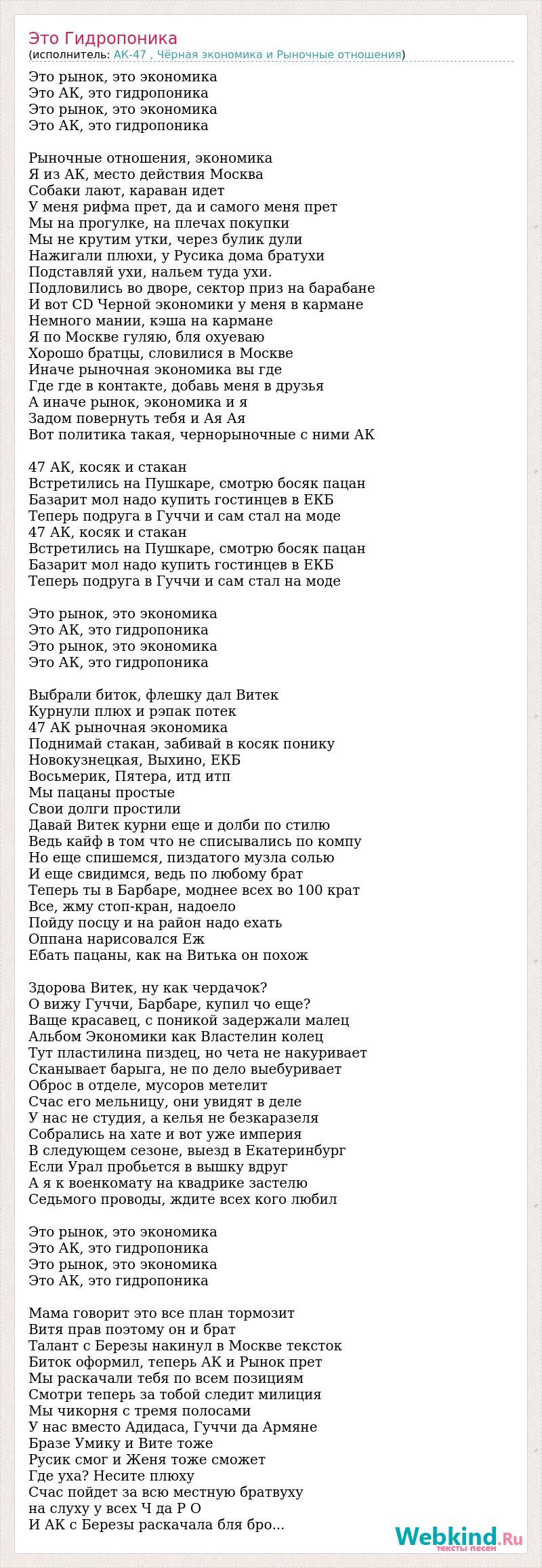 Это рынок, это экономика Это АК, это гидропоника Это рынок, это экономика Это АК, это гидропоника Рыночные отношения, экономика Я из АК, место действия Москва Собаки лают, караван идет У меня рифма прет, да и самого меня прет Мы на прогулке, на плечах покупки Мы не крутим утки, через булик дули Нажигали плюхи, у Русика дома братухи Подставляй ухи, нальем туда ухи. Подловились во дворе, сектор приз на барабане И вот CD Черной экономики у меня в кармане Немного мании, кэша на кармане Я по Москве гуляю, бля охуеваю Хорошо братцы, словилися в Москве Иначе рыночная экономика вы где Где где в контакте, добавь меня в друзья А иначе рынок, экономика и я Задом повернуть тебя и Ая Ая Вот политика такая, чернорыночные с ними АК 47 АК, косяк и стакан Встретились на Пушкаре, смотрю босяк пацан Базарит мол надо купить гостинцев в ЕКБ Теперь подруга в Гуччи и сам стал на моде 47 АК, косяк и стакан Встретились на Пушкаре, смотрю босяк пацан Базарит мол надо купить гостинцев в ЕКБ Теперь подруга в Гуччи и сам стал на моде Это рынок, это экономика Это АК, это гидропоника Это рынок, это экономика Это АК, это гидропоника Выбрали биток, флешку дал Витек Курнули плюх и рэпак потек 47 АК рыночная экономика Поднимай стакан, забивай в косяк понику Новокузнецкая, Выхино, ЕКБ Восьмерик, Пятера, итд итп Мы пацаны простые Свои долги простили Давай Витек курни еще и долби по стилю Ведь кайф в том что не списывались по компу Но еще спишемся, пиздатого музла солью И еще свидимся, ведь по любому брат Теперь ты в Барбаре, моднее всех во 100 крат Все, жму стоп-кран, надоело Пойду посцу и на район надо ехать Оппана нарисовался Еж Ебать пацаны, как на Витька он похож Здорова Витек, ну как чердачок? О вижу Гуччи, Барбаре, купил чо еще? Ваще красавец, с поникой задержали малец Альбом Экономики как Властелин колец Тут пластилина пиздец, но чета не накуривает Сканывает барыга, не по дело выебуривает Оброс в отделе, мусоров метелит Счас его мельницу, они увидят в деле У нас не студия, а келья не безкаразеля Собрались на хате и вот уже империя В следующем сезоне, выезд в Екатеринбург Если Урал пробьется в вышку вдруг А я к военкомату на квадрике застелю Седьмого проводы, ждите всех кого любил Это рынок, это экономика Это АК, это гидропоника Это рынок, это экономика Это АК, это гидропоника Мама говорит это все план тормозит Витя прав поэтому он и брат Талант с Березы накинул в Москве тексток Биток оформил, теперь АК и Рынок прет Мы раскачали тебя по всем позициям Смотри теперь за тобой следит милиция Мы чикорня с тремя полосами У нас вместо Адидаса, Гуччи да Армяне Бразе Умику и Вите тоже Русик смог и Женя тоже сможет Где уха? Несите плюху Счас пойдет за всю местную братвуху на слуху у всех Ч да Р О И АК с Березы раскачала бля бро...