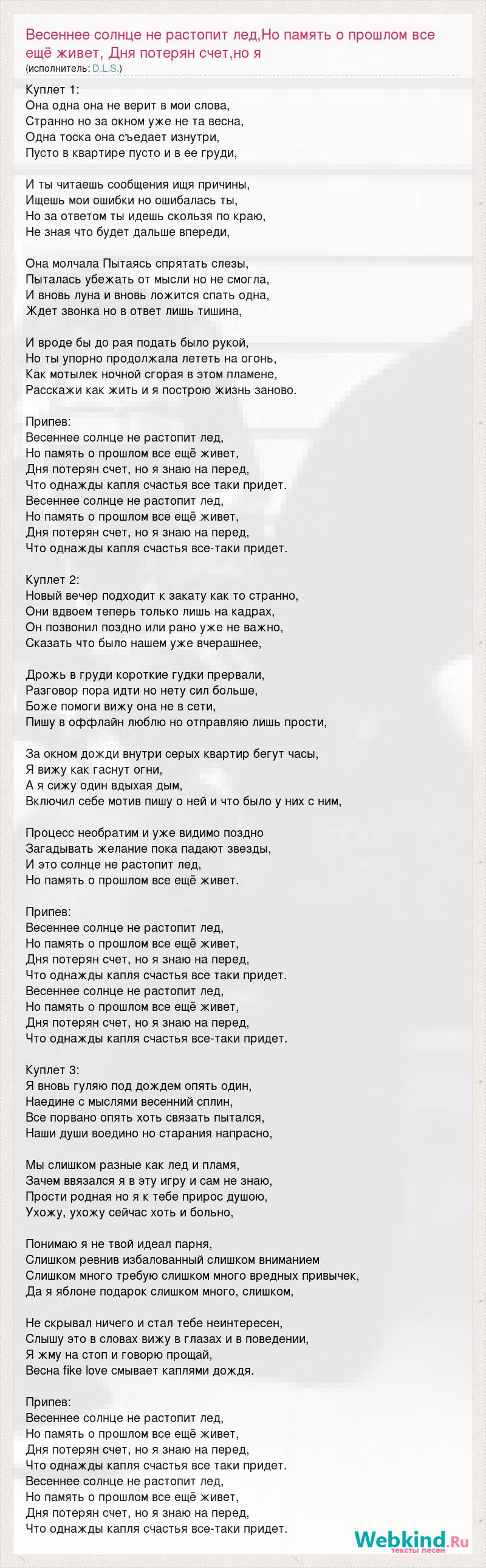 Куплет 1: Она одна она не верит в мои слова, Странно но за окном уже не та весна, Одна тоска она съедает изнутри, Пусто в квартире пусто и в ее груди, И ты читаешь сообщения ищя причины, Ищешь мои ошибки но ошибалась ты, Но за ответом ты идешь скользя по краю, Не зная что будет дальше впереди, Она молчала Пытаясь спрятать слезы, Пыталась убежать от мысли но не смогла, И вновь луна и вновь ложится спать одна, Ждет звонка но в ответ лишь тишина, И вроде бы до рая подать было рукой, Но ты упорно продолжала лететь на огонь, Как мотылек ночной сгорая в этом пламене, Расскажи как жить и я построю жизнь заново. Припев: Весеннее солнце не растопит лед, Но память о прошлом все ещё живет, Дня потерян счет, но я знаю на перед, Что однажды капля счастья все таки придет. Весеннее солнце не растопит лед, Но память о прошлом все ещё живет, Дня потерян счет, но я знаю на перед, Что однажды капля счастья все-таки придет. Куплет 2: Новый вечер подходит к закату как то странно, Они вдвоем теперь только лишь на кадрах, Он позвонил поздно или рано уже не важно, Сказать что было нашем уже вчерашнее, Дрожь в груди короткие гудки прервали, Разговор пора идти но нету сил больше, Боже помоги вижу она не в сети, Пишу в оффлайн люблю но отправляю лишь прости, За окном дожди внутри серых квартир бегут часы, Я вижу как гаснут огни, А я сижу один вдыхая дым, Включил себе мотив пишу о ней и что было у них с ним, Процесс необратим и уже видимо поздно Загадывать желание пока падают звезды, И это солнце не растопит лед, Но память о прошлом все ещё живет. Припев: Весеннее солнце не растопит лед, Но память о прошлом все ещё живет, Дня потерян счет, но я знаю на перед, Что однажды капля счастья все таки придет. Весеннее солнце не растопит лед, Но память о прошлом все ещё живет, Дня потерян счет, но я знаю на перед, Что однажды капля счастья все-таки придет. Куплет 3: Я вновь гуляю под дождем опять один, Наедине с мыслями весенний сплин, Все порвано опять хоть связать пытался, Наши души воедино но старания напрасно, Мы слишком разные как лед и пламя, Зачем ввязался я в эту игру и сам не знаю, Прости родная но я к тебе прирос душою, Ухожу, ухожу сейчас хоть и больно, Понимаю я не твой идеал парня, Слишком ревнив избалованный слишком вниманием Слишком много требую слишком много вредных привычек, Да я яблоне подарок слишком много, слишком, Не скрывал ничего и стал тебе неинтересен, Слышу это в словах вижу в глазах и в поведении, Я жму на стоп и говорю прощай, Весна fike love смывает каплями дождя. Припев: Весеннее солнце не растопит лед, Но память о прошлом все ещё живет, Дня потерян счет, но я знаю на перед, Что однажды капля счастья все таки придет. Весеннее солнце не растопит лед, Но память о прошлом все ещё живет, Дня потерян счет, но я знаю на перед, Что однажды капля счастья все-таки придет.