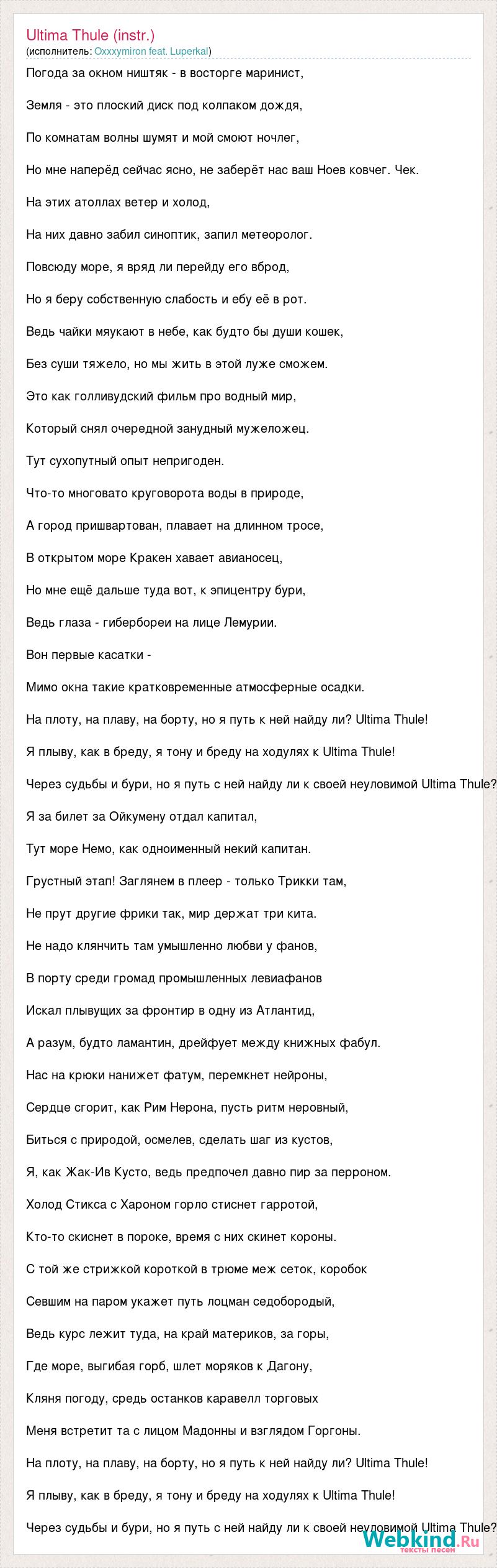 Погода за окном ништяк - в восторге маринист, Земля - это плоский диск под колпаком дождя, По комнатам волны шумят и мой смоют ночлег, Но мне наперёд сейчас ясно, не заберёт нас ваш Ноев ковчег. Чек. На этих атоллах ветер и холод, На них давно забил синоптик, запил метеоролог. Повсюду море, я вряд ли перейду его вброд, Но я беру собственную слабость и ебу её в рот. Ведь чайки мяукают в небе, как будто бы души кошек, Без суши тяжело, но мы жить в этой луже сможем. Это как голливудский фильм про водный мир, Который снял очередной занудный мужеложец. Тут сухопутный опыт непригоден. Что-то многовато круговорота воды в природе, А город пришвартован, плавает на длинном тросе, В открытом море Кракен хавает авианосец, Но мне ещё дальше туда вот, к эпицентру бури, Ведь глаза - гибербореи на лице Лемурии. Вон первые касатки - Мимо окна такие кратковременные атмосферные осадки. На плоту, на плаву, на борту, но я путь к ней найду ли? Ultima Thule! Я плыву, как в бреду, я тону и бреду на ходулях к Ultima Thule! Через судьбы и бури, но я путь с ней найду ли к своей неуловимой Ultima Thule? Я за билет за Ойкумену отдал капитал, Тут море Немо, как одноименный некий капитан. Грустный этап! Заглянем в плеер - только Трикки там, Не прут другие фрики так, мир держат три кита. Не надо клянчить там умышленно любви у фанов, В порту среди громад промышленных левиафанов Искал плывущих за фронтир в одну из Атлантид, А разум, будто ламантин, дрейфует между книжных фабул. Нас на крюки нанижет фатум, перемкнет нейроны, Сердце сгорит, как Рим Нерона, пусть ритм неровный, Биться с природой, осмелев, сделать шаг из кустов, Я, как Жак-Ив Кусто, ведь предпочел давно пир за перроном. Холод Стикса с Хароном горло стиснет гарротой, Кто-то скиснет в пороке, время с них скинет короны. С той же стрижкой короткой в трюме меж сеток, коробок Севшим на паром укажет путь лоцман седобородый, Ведь курс лежит туда, на край материков, за горы, Где море, выгибая горб, шлет моряков к Дагону, Кляня погоду, средь останков каравелл торговых Меня встретит та с лицом Мадонны и взглядом Горгоны. На плоту, на плаву, на борту, но я путь к ней найду ли? Ultima Thule! Я плыву, как в бреду, я тону и бреду на ходулях к Ultima Thule! Через судьбы и бури, но я путь с ней найду ли к своей неуловимой Ultima Thule?