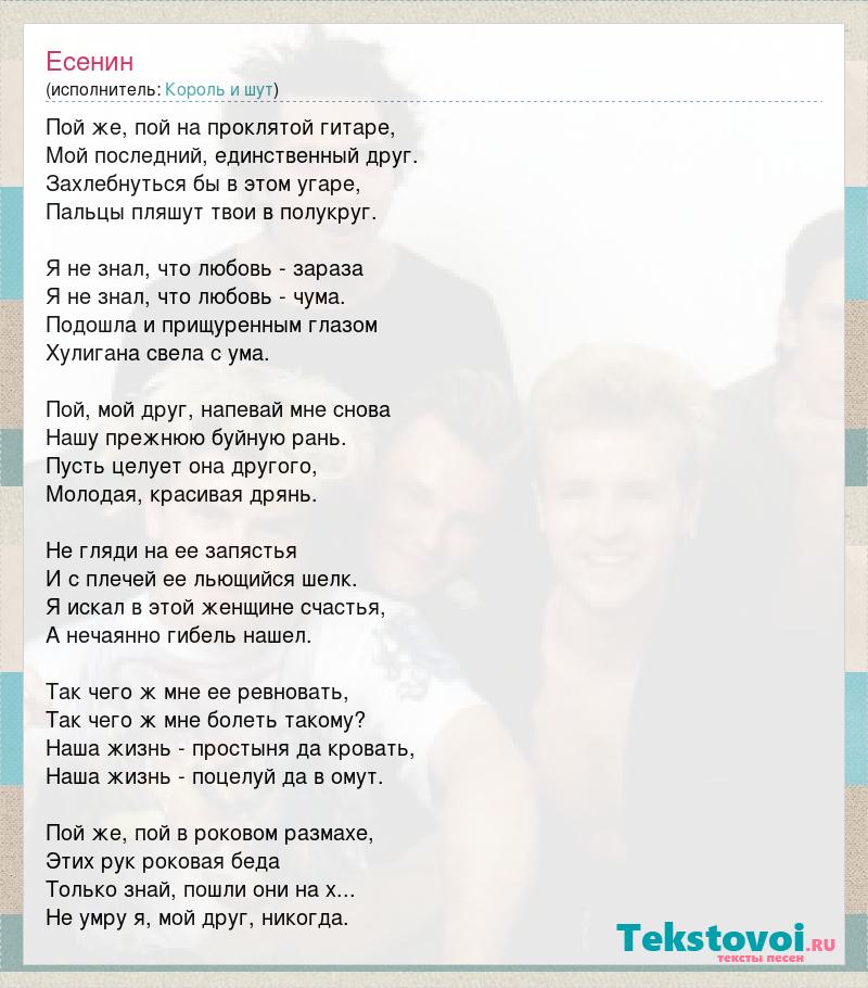 Пой же, пой на проклятой гитаре, Мой последний, единственный друг. Захлебнуться бы в этом угаре, Пальцы пляшут твои в полукруг. Я не знал, что любовь - зараза Я не знал, что любовь - чума. Подошла и прищуренным глазом Хулигана свела с ума. Пой, мой друг, напевай мне снова Нашу прежнюю буйную рань. Пусть целует она другого, Молодая, красивая дрянь. Не гляди на ее запястья И с плечей ее льющийся шелк. Я искал в этой женщине счастья, А нечаянно гибель нашел. Так чего ж мне ее ревновать, Так чего ж мне болеть такому? Наша жизнь - простыня да кровать, Наша жизнь - поцелуй да в омут. Пой же, пой в роковом размахе, Этих рук роковая беда Только знай, пошли они на х... Не умру я, мой друг, никогда.