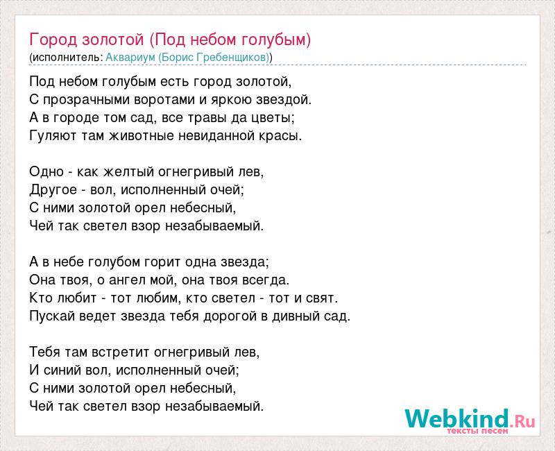 Под небом голубым есть город золотой, С прозрачными воротами и яркою звездой. А в городе том сад, все травы да цветы; Гуляют там животные невиданной красы. Одно - как желтый огнегривый лев, Другое - вол, исполненный очей; С ними золотой орел небесный, Чей так светел взор незабываемый. А в небе голубом горит одна звезда; Она твоя, о ангел мой, она твоя всегда. Кто любит - тот любим, кто светел - тот и свят. Пускай ведет звезда тебя дорогой в дивный сад. Тебя там встретит огнегривый лев, И синий вол, исполненный очей; С ними золотой орел небесный, Чей так светел взор незабываемый.