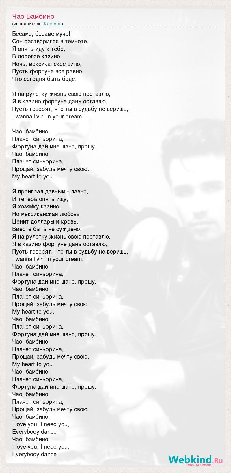 Бесаме, бесаме мучо! Сон растворился в темноте, Я опять иду к тебе, В дорогое казино. Ночь, мексиканское вино, Пусть фортуне все равно, Что сегодня быть беде. Я на рулетку жизнь свою поставлю, Я в казино фортуне дань оставлю, Пусть говорят, что ты в судьбу не веришь, I wanna livin' in your dream. Чао, бамбино, Плачет синьорина, Фортуна дай мне шанс, прошу. Чао, бамбино, Плачет синьорина, Прощай, забудь мечту свою. My heart to you. Я проиграл давным - давно, И теперь опять ищу, Я хозяйку казино. Но мексиканская любовь Ценит доллары и кровь, Вместе быть не суждено. Я на рулетку жизнь свою поставлю, Я в казино фортуне дань оставлю, Пусть говорят, что ты в судьбу не веришь, I wanna livin' in your dream. Чао, бамбино, Плачет синьорина, Фортуна дай мне шанс, прошу. Чао, бамбино, Плачет синьорина, Прощай, забудь мечту свою. My heart to you. Чао, бамбино, Плачет синьорина, Фортуна дай мне шанс, прошу. Чао, бамбино, Плачет синьорина, Прощай, забудь мечту свою. My heart to you. Чао, бамбино, Плачет синьорина, Фортуна дай мне шанс, прошу. Чао, бамбино, Плачет синьорина, Прощай, забудь мечту свою Чао, бамбино. I love you, I need you, Everybody dance Чао, бамбино. I love you, I need you, Everybody dance
