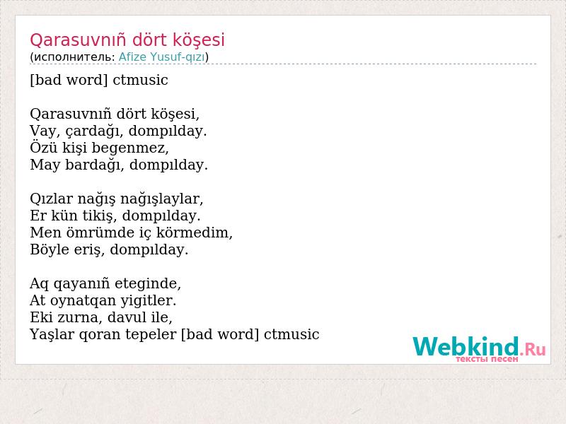 [bad word] ctmusic Qarasuvnıñ dört köşesi, Vay, çardağı, dompılday. Özü kişi begenmez, May bardağı, dompılday. Qızlar nağış nağışlaylar, Er kün tikiş, dompılday. Men ömrümde iç körmedim, Böyle eriş, dompılday. Aq qayanıñ eteginde, At oynatqan yigitler. Eki zurna, davul ile, Yaşlar qoran tepeler [bad word] ctmusic