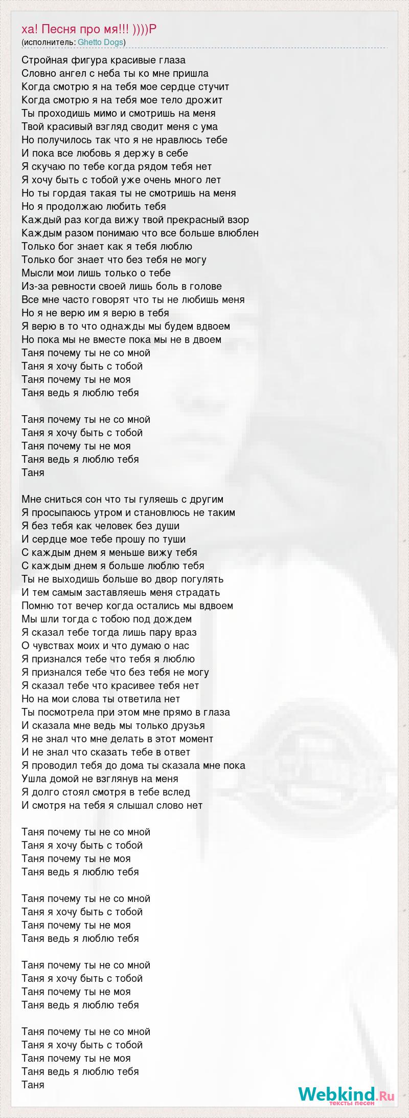 Стройная фигура красивые глаза Словно ангел с неба ты ко мне пришла Когда смотрю я на тебя мое сердце стучит Когда смотрю я на тебя мое тело дрожит Ты проходишь мимо и смотришь на меня Твой красивый взгляд сводит меня с ума Но получилось так что я не нравлюсь тебе И пока все любовь я держу в себе Я скучаю по тебе когда рядом тебя нет Я хочу быть с тобой уже очень много лет Но ты гордая такая ты не смотришь на меня Но я продолжаю любить тебя Каждый раз когда вижу твой прекрасный взор Каждым разом понимаю что все больше влюблен Только бог знает как я тебя люблю Только бог знает что без тебя не могу Мысли мои лишь только о тебе Из-за ревности своей лишь боль в голове Все мне часто говорят что ты не любишь меня Но я не верю им я верю в тебя Я верю в то что однажды мы будем вдвоем Но пока мы не вместе пока мы не в двоем Таня почему ты не со мной Таня я хочу быть с тобой Таня почему ты не моя Таня ведь я люблю тебя Таня почему ты не со мной Таня я хочу быть с тобой Таня почему ты не моя Таня ведь я люблю тебя Таня Мне сниться сон что ты гуляешь с другим Я просыпаюсь утром и становлюсь не таким Я без тебя как человек без души И сердце мое тебе прошу по туши С каждым днем я меньше вижу тебя С каждым днем я больше люблю тебя Ты не выходишь больше во двор погулять И тем самым заставляешь меня страдать Помню тот вечер когда остались мы вдвоем Мы шли тогда с тобою под дождем Я сказал тебе тогда лишь пару враз О чувствах моих и что думаю о нас Я признался тебе что тебя я люблю Я признался тебе что без тебя не могу Я сказал тебе что красивее тебя нет Но на мои слова ты ответила нет Ты посмотрела при этом мне прямо в глаза И сказала мне ведь мы только друзья Я не знал что мне делать в этот момент И не знал что сказать тебе в ответ Я проводил тебя до дома ты сказала мне пока Ушла домой не взглянув на меня Я долго стоял смотря в тебе вслед И смотря на тебя я слышал слово нет Таня почему ты не со мной Таня я хочу быть с тобой Таня почему ты не моя Таня ведь я люблю тебя Таня почему ты не со мной Таня я хочу быть с тобой Таня почему ты не моя Таня ведь я люблю тебя Таня почему ты не со мной Таня я хочу быть с тобой Таня почему ты не моя Таня ведь я люблю тебя Таня почему ты не со мной Таня я хочу быть с тобой Таня почему ты не моя Таня ведь я люблю тебя Таня