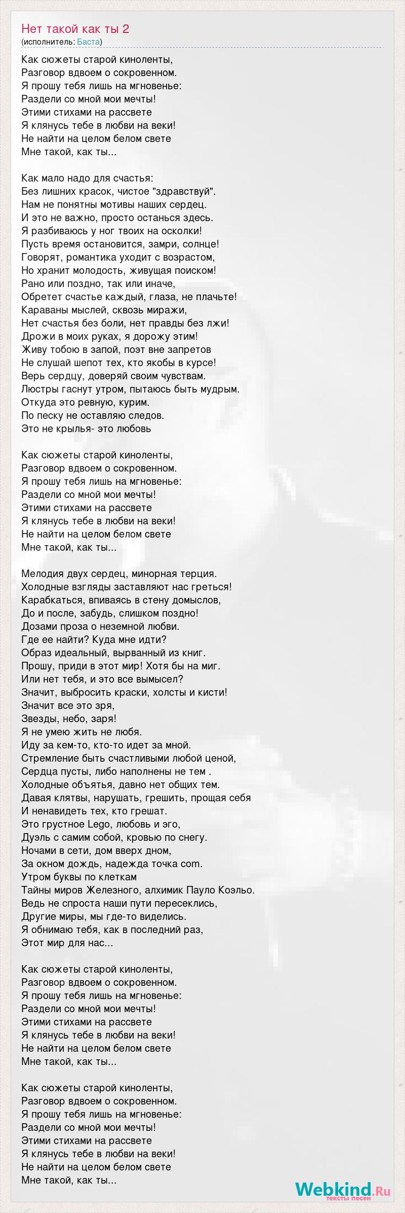 Как сюжеты старой киноленты, Разговор вдвоем о сокровенном. Я прошу тебя лишь на мгновенье: Раздели со мной мои мечты! Этими стихами на рассвете Я клянусь тебе в любви на веки! Не найти на целом белом свете Мне такой, как ты... Как мало надо для счастья: Без лишних красок, чистое "здравствуй". Нам не понятны мотивы наших сердец. И это не важно, просто останься здесь. Я разбиваюсь у ног твоих на осколки! Пусть время остановится, замри, солнце! Говорят, романтика уходит с возрастом, Но хранит молодость, живущая поиском! Рано или поздно, так или иначе, Обретет счастье каждый, глаза, не плачьте! Караваны мыслей, сквозь миражи, Нет счастья без боли, нет правды без лжи! Дрожи в моих руках, я дорожу этим! Живу тобою в запой, поэт вне запретов Не слушай шепот тех, кто якобы в курсе! Верь сердцу, доверяй своим чувствам. Люстры гаснут утром, пытаюсь быть мудрым. Откуда это ревную, курим. По песку не оставляю следов. Это не крылья- это любовь Как сюжеты старой киноленты, Разговор вдвоем о сокровенном. Я прошу тебя лишь на мгновенье: Раздели со мной мои мечты! Этими стихами на рассвете Я клянусь тебе в любви на веки! Не найти на целом белом свете Мне такой, как ты... Мелодия двух сердец, минорная терция. Холодные взгляды заставляют нас греться! Карабкаться, впиваясь в стену домыслов, До и после, забудь, слишком поздно! Дозами проза о неземной любви. Где ее найти? Куда мне идти? Образ идеальный, вырванный из книг. Прошу, приди в этот мир! Хотя бы на миг. Или нет тебя, и это все вымысел? Значит, выбросить краски, холсты и кисти! Значит все это зря, Звезды, небо, заря! Я не умею жить не любя. Иду за кем-то, кто-то идет за мной. Стремление быть счастливыми любой ценой, Сердца пусты, либо наполнены не тем . Холодные объятья, давно нет общих тем. Давая клятвы, нарушать, грешить, прощая себя И ненавидеть тех, кто грешат. Это грустное Lego, любовь и эго, Дуэль с самим собой, кровью по снегу. Ночами в сети, дом вверх дном, За окном дождь, надежда точка com. Утром буквы по клеткам Тайны миров Железного, алхимик Пауло Коэльо. Ведь не спроста наши пути пересеклись, Другие миры, мы где-то виделись. Я обнимаю тебя, как в последний раз, Этот мир для нас... Как сюжеты старой киноленты, Разговор вдвоем о сокровенном. Я прошу тебя лишь на мгновенье: Раздели со мной мои мечты! Этими стихами на рассвете Я клянусь тебе в любви на веки! Не найти на целом белом свете Мне такой, как ты... Как сюжеты старой киноленты, Разговор вдвоем о сокровенном. Я прошу тебя лишь на мгновенье: Раздели со мной мои мечты! Этими стихами на рассвете Я клянусь тебе в любви на веки! Не найти на целом белом свете Мне такой, как ты...