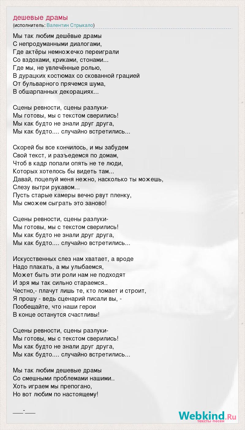Мы так любим дешёвые драмы С непродуманными диалогами, Где актёры немножечко переиграли Со вздохами, криками, стонами... Где мы, не увлечённые ролью, В дурацких костюмах со скованной грацией От бульварного прячемся шума, В обшарпанных декорациях... Сцены ревности, сцены разлуки- Мы готовы, мы с текстом сверились! Мы как будто не знали друг друга, Мы как будто.... случайно встретились... Скорей бы все кончилось, и мы забудем Свой текст, и разъедемся по домам, Чтоб в кадр попали опять не те люди, Которых хотелось бы видеть там... Давай, поцелуй меня нежно, насколько ты можешь, Слезу вытри рукавом... Пусть старые камеры вечно рвут пленку, Мы сможем сыграть это заново! Сцены ревности, сцены разлуки- Мы готовы, мы с текстом сверились! Мы как будто не знали друг друга, Мы как будто.... случайно встретились... Искусственных слез нам хватает, а вроде Надо плакать, а мы улыбаемся, Может быть эти роли нам не подходят И зря мы так сильно стараемся.. Честно,- плачут лишь те, кто ломает и строит, Я прошу - ведь сценарий писали вы, - Пообещайте, что наши герои В конце останутся счастливы! Сцены ревности, сцены разлуки- Мы готовы, мы с текстом сверились! Мы как будто не знали друг друга, Мы как будто.... случайно встретились... Мы так любим дешевые драмы Со смешными проблемами нашими.. Хоть играем мы препогано, Но вот любим по настоящему! ___-___