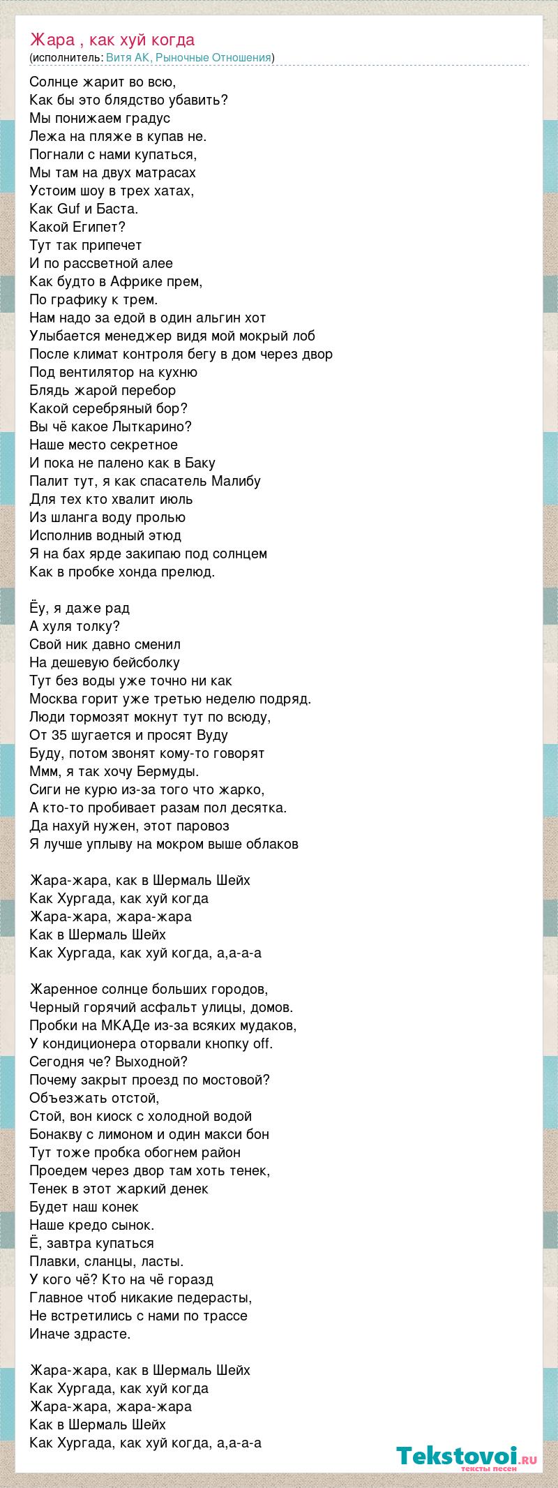 Солнце жарит во всю, Как бы это блядство убавить? Мы понижаем градус Лежа на пляже в купав не. Погнали с нами купаться, Мы там на двух матрасах Устоим шоу в трех хатах, Как Guf и Баста. Какой Египет? Тут так припечет И по рассветной алее Как будто в Африке прем, По графику к трем. Нам надо за едой в один альгин хот Улыбается менеджер видя мой мокрый лоб После климат контроля бегу в дом через двор Под вентилятор на кухню Блядь жарой перебор Какой серебряный бор? Вы чё какое Лыткарино? Наше место секретное И пока не палено как в Баку Палит тут, я как спасатель Малибу Для тех кто хвалит июль Из шланга воду пролью Исполнив водный этюд Я на бах ярде закипаю под солнцем Как в пробке хонда прелюд. Ёу, я даже рад А хуля толку? Свой ник давно сменил На дешевую бейсболку Тут без воды уже точно ни как Москва горит уже третью неделю подряд. Люди тормозят мокнут тут по всюду, От 35 шугается и просят Вуду Буду, потом звонят кому-то говорят Ммм, я так хочу Бермуды. Сиги не курю из-за того что жарко, А кто-то пробивает разам пол десятка. Да нахуй нужен, этот паровоз Я лучше уплыву на мокром выше облаков Жара-жара, как в Шермаль Шейх Как Хургада, как хуй когда Жара-жара, жара-жара Как в Шермаль Шейх Как Хургада, как хуй когда, а,а-а-а Жаренное солнце больших городов, Черный горячий асфальт улицы, домов. Пробки на МКАДе из-за всяких мудаков, У кондиционера оторвали кнопку оff. Сегодня че? Выходной? Почему закрыт проезд по мостовой? Объезжать отстой, Стой, вон киоск с холодной водой Бонакву с лимоном и один макси бон Тут тоже пробка обогнем район Проедем через двор там хоть тенек, Тенек в этот жаркий денек Будет наш конек Наше кредо сынок. Ё, завтра купаться Плавки, сланцы, ласты. У кого чё? Кто на чё горазд Главное чтоб никакие педерасты, Не встретились с нами по трассе Иначе здрасте. Жара-жара, как в Шермаль Шейх Как Хургада, как хуй когда Жара-жара, жара-жара Как в Шермаль Шейх Как Хургада, как хуй когда, а,а-а-а
