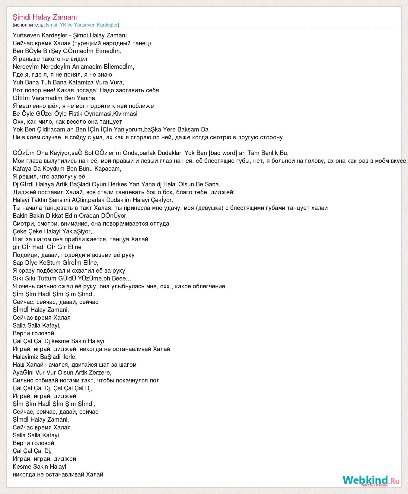 Yurtseven Kardeşler - Şimdi Halay Zamanı Сейчас время Халая (турецкий народный танец) Ben BÖyle BİrŞey GÖrmedİm Etmedİm, Я раньше такого не видел Nerdeyİm Neredeyİm Anlamadim Bİlemedİm, Где я, где я, я не понял, я не знаю Yuh Bana Tuh Bana Kafamiza Vura Vura, Вот позор мне! Какая досада! Надо заставить себя Gİttİm Varamadim Ben Yanina, Я медленно шёл, я не мог подойти к ней поближе Be Öyle GÜzel Öyle Fistik Oynamasi,Kivirmasi Охх, как мило, как весело она танцует Yok Ben Çildiracam,ah Ben İÇİn İÇİn Yaniyorum,baŞka Yere Baksam Da Ни в коем случае, я сойду с ума, ах как я сгораю по ней, даже когда смотрю в другую сторону GÖzÜm Ona Kayiyor,saĞ Sol GÖzlerİm Onda,parlak Dudaklari Yok Ben [bad word] ah Tam Benlİk Bu, Мои глаза вылупились на неё, мой правый и левый глаз на ней, её блестящие губы, нет, я больной на голову, ах она как раз в моём вкусе Kafaya Da Koydum Ben Bunu Kapacam, Я решил, что заполучу её Dj Gİrdİ Halaya Artik BaŞladi Oyun Herkes Yan Yana,dj Helal Olsun Be Sana, Диджей поставил Халай, все стали танцевать бок о бок, благо тебе, диджей! Halayi Taktin Şansimi AÇtin,parlak Dudaklim Halayi Çekİyor, Ты начала танцевать в такт Халая, ты принесла мне удачу, моя (девушка) с блестящими губами танцует халай Bakin Bakin Dİkkat Edİn Oradan DÖnÜyor, Смотри, смотри, внимание, она поворачивается оттуда Çeke Çeke Halayi YaklaŞiyor, Шаг за шагом она приближается, танцуя Халай gİr Gİr Hadİ Gİr Gİr Elİne Подойди, давай, подойди и возьми её руку Şap Dİye KoŞtum Gİrdİm Elİne, Я сразу подбежал и схватил её за руку Sıkı Sıkı Tuttum GÜldÜ YÜzÜme,oh Beee... Я очень сильно сжал её руку, она улыбнулась мне, охх , какое облегчение Şİm Şİm Hadİ Şİm Şİm Şİmdİ, Сейчас, сейчас, давай, сейчас Şİmdİ Halay Zamani, Сейчас время Халая Salla Salla Kafayi, Верти головой Çal Çal Çal Dj,kesme Sakin Halayi, Играй, играй, диджей, никогда не останавливай Халай Halayimiz BaŞladi İlerle, Наш Халай начался, двигайся шаг за шагом AyaĞini Vur Vur Olsun Artik Zerzere, Сильно отбивай ногами такт, чтобы покачнулся пол Çal Çal Çal Dj, Çal Çal Çal Dj, Играй, играй, диджей Şİm Şİm Hadİ Şİm Şİm Şİmdİ, Сейчас, сейчас, давай, сейчас Şİmdİ Halay Zamani, Сейчас время Халая Salla Salla Kafayi, Верти головой Çal Çal Çal Dj, Играй, играй, диджей Кesme Sakin Halayi никогда не останавливай Халай