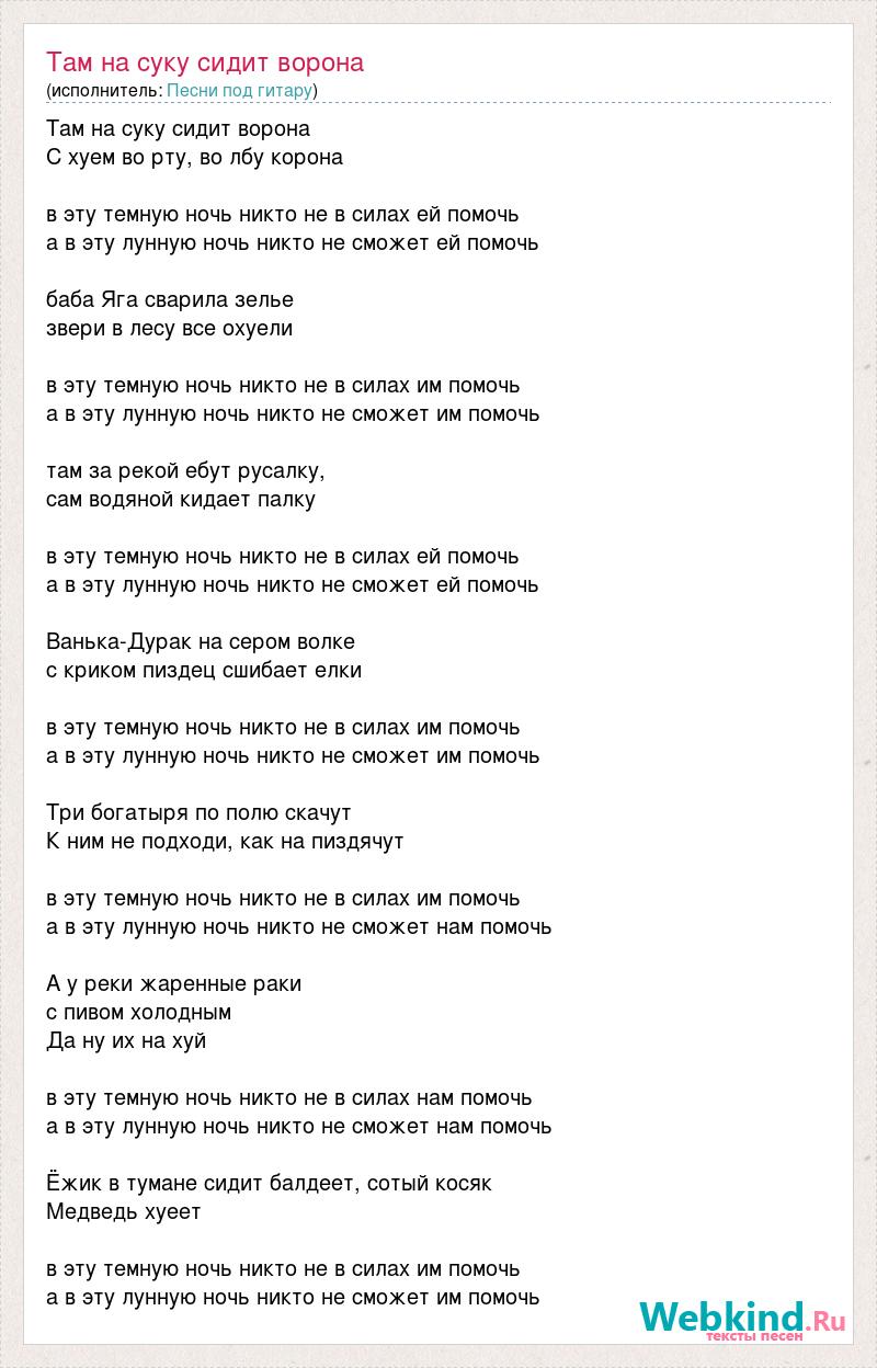 Там на суку сидит ворона С хуем во рту, во лбу корона в эту темную ночь никто не в силах ей помочь а в эту лунную ночь никто не сможет ей помочь баба Яга сварила зелье звери в лесу все охуели в эту темную ночь никто не в силах им помочь а в эту лунную ночь никто не сможет им помочь там за рекой ебут русалку, сам водяной кидает палку в эту темную ночь никто не в силах ей помочь а в эту лунную ночь никто не сможет ей помочь Ванька-Дурак на сером волке с криком пиздец сшибает елки в эту темную ночь никто не в силах им помочь а в эту лунную ночь никто не сможет им помочь Три богатыря по полю скачут К ним не подходи, как на пиздячут в эту темную ночь никто не в силах им помочь а в эту лунную ночь никто не сможет нам помочь А у реки жаренные раки с пивом холодным Да ну их на хуй в эту темную ночь никто не в силах нам помочь а в эту лунную ночь никто не сможет нам помочь Ёжик в тумане сидит балдеет, сотый косяк Медведь хуеет в эту темную ночь никто не в силах им помочь а в эту лунную ночь никто не сможет им помочь
