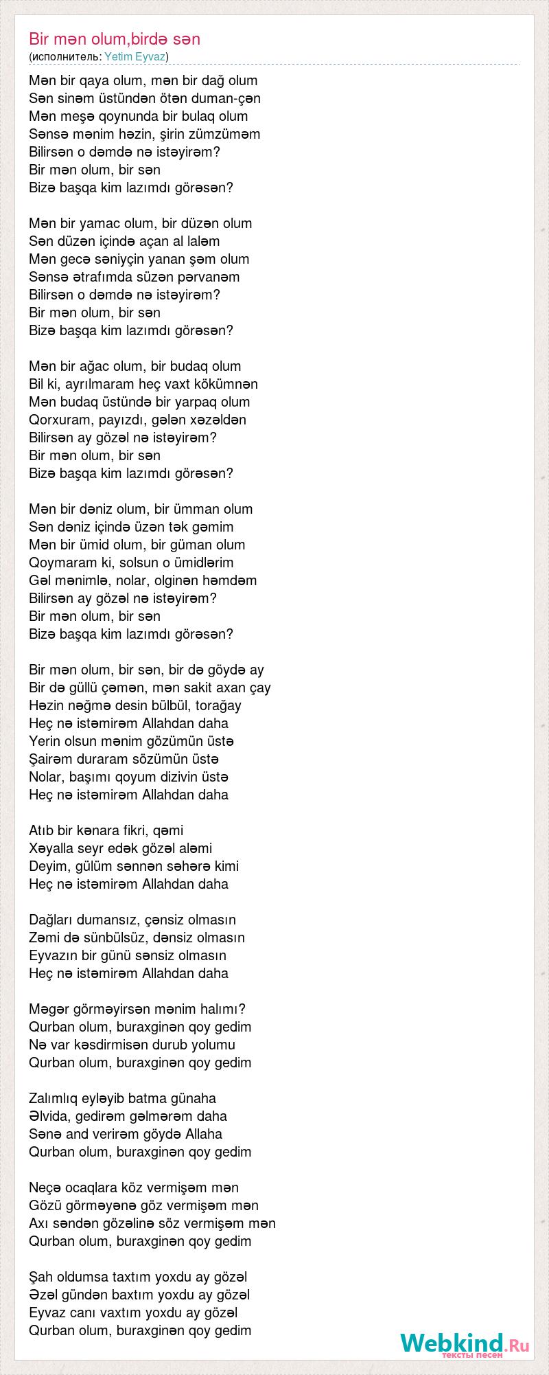Mən bir qaya olum, mən bir dağ olum Sən sinəm üstündən ötən duman-çən Mən meşə qoynunda bir bulaq olum Sənsə mənim həzin, şirin zümzüməm Bilirsən o dəmdə nə istəyirəm? Bir mən olum, bir sən Bizə başqa kim lazımdı görəsən? Mən bir yamac olum, bir düzən olum Sən düzən içində açan al laləm Mən gecə səniyçin yanan şəm olum Sənsə ətrafımda süzən pərvanəm Bilirsən o dəmdə nə istəyirəm? Bir mən olum, bir sən Bizə başqa kim lazımdı görəsən? Mən bir ağac olum, bir budaq olum Bil ki, ayrılmaram heç vaxt kökümnən Mən budaq üstündə bir yarpaq olum Qorxuram, payızdı, gələn xəzəldən Bilirsən ay gözəl nə istəyirəm? Bir mən olum, bir sən Bizə başqa kim lazımdı görəsən? Mən bir dəniz olum, bir ümman olum Sən dəniz içində üzən tək gəmim Mən bir ümid olum, bir güman olum Qoymaram ki, solsun o ümidlərim Gəl mənimlə, nolar, olginən həmdəm Bilirsən ay gözəl nə istəyirəm? Bir mən olum, bir sən Bizə başqa kim lazımdı görəsən? Bir mən olum, bir sən, bir də göydə ay Bir də güllü çəmən, mən sakit axan çay Həzin nəğmə desin bülbül, torağay Heç nə istəmirəm Allahdan daha Yerin olsun mənim gözümün üstə Şairəm duraram sözümün üstə Nolar, başımı qoyum dizivin üstə Heç nə istəmirəm Allahdan daha Atıb bir kənara fikri, qəmi Xəyalla seyr edək gözəl aləmi Deyim, gülüm sənnən səhərə kimi Heç nə istəmirəm Allahdan daha Dağları dumansız, çənsiz olmasın Zəmi də sünbülsüz, dənsiz olmasın Eyvazın bir günü sənsiz olmasın Heç nə istəmirəm Allahdan daha Məgər görməyirsən mənim halımı? Qurban olum, buraxginən qoy gedim Nə var kəsdirmisən durub yolumu Qurban olum, buraxginən qoy gedim Zalımlıq eyləyib batma günaha Əlvida, gedirəm gəlmərəm daha Sənə and verirəm göydə Allaha Qurban olum, buraxginən qoy gedim Neçə ocaqlara köz vermişəm mən Gözü görməyənə göz vermişəm mən Axı səndən gözəlinə söz vermişəm mən Qurban olum, buraxginən qoy gedim Şah oldumsa taxtım yoxdu ay gözəl Əzəl gündən baxtım yoxdu ay gözəl Eyvaz canı vaxtım yoxdu ay gözəl Qurban olum, buraxginən qoy gedim