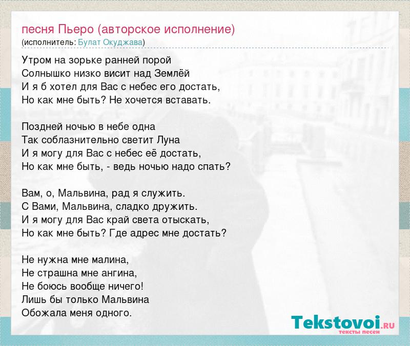 Утром на зорьке ранней порой Солнышко низко висит над Землёй И я б хотел для Вас с небес его достать, Но как мне быть? Не хочется вставать. Поздней ночью в небе одна Так соблазнительно светит Луна И я могу для Вас с небес её достать, Но как мне быть, - ведь ночью надо спать? Вам, о, Мальвина, рад я служить. С Вами, Мальвина, сладко дружить. И я могу для Вас край света отыскать, Но как мне быть? Где адрес мне достать? Не нужна мне малина, Не страшна мне ангина, Не боюсь вообще ничего! Лишь бы только Мальвина Обожала меня одного.