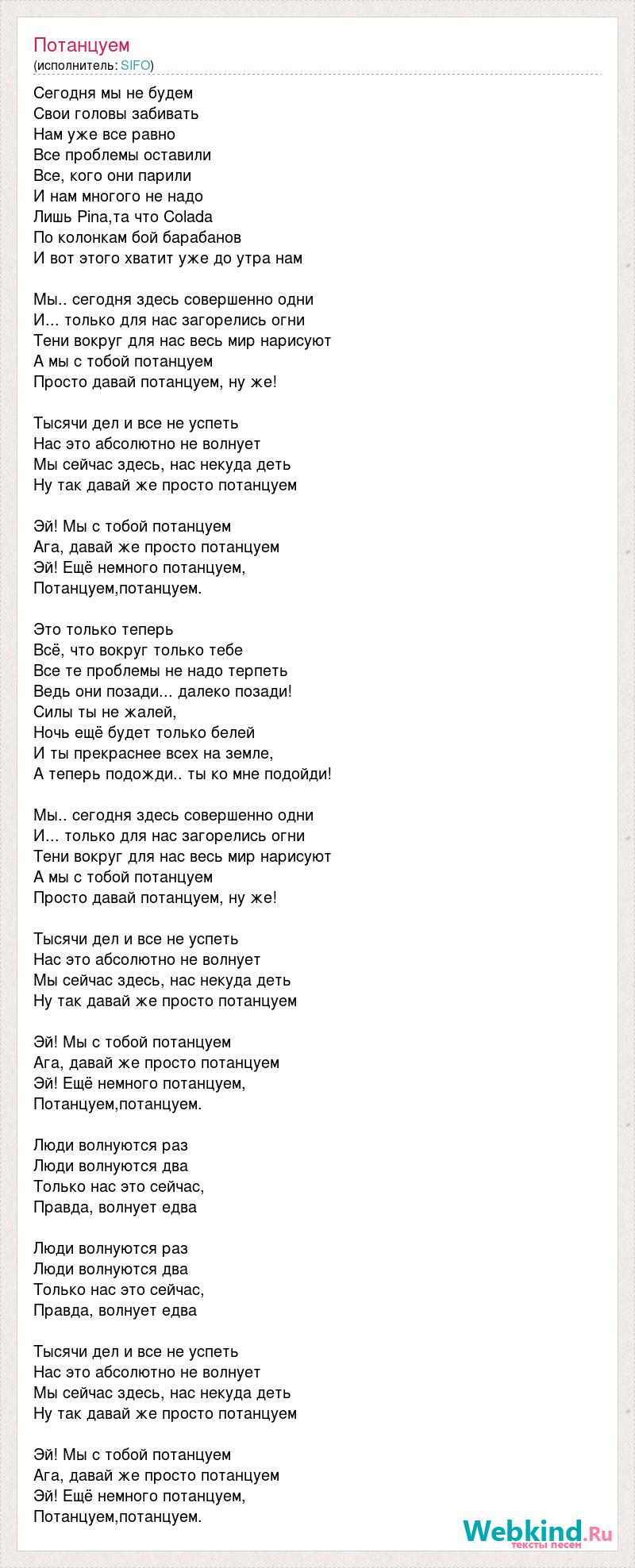 Сегодня мы не будем Свои головы забивать Нам уже все равно Все проблемы оставили Все, кого они парили И нам многого не надо Лишь Pina,та что Сolada По колонкам бой барабанов И вот этого хватит уже до утра нам Мы.. сегодня здесь совершенно одни И... только для нас загорелись огни Тени вокруг для нас весь мир нарисуют А мы с тобой потанцуем Просто давай потанцуем, ну же! Тысячи дел и все не успеть Нас это абсолютно не волнует Мы сейчас здесь, нас некуда деть Ну так давай же просто потанцуем Эй! Мы с тобой потанцуем Ага, давай же просто потанцуем Эй! Ещё немного потанцуем, Потанцуем,потанцуем. Это только теперь Всё, что вокруг только тебе Все те проблемы не надо терпеть Ведь они позади... далеко позади! Силы ты не жалей, Ночь ещё будет только белей И ты прекраснее всех на земле, А теперь подожди.. ты ко мне подойди! Мы.. сегодня здесь совершенно одни И... только для нас загорелись огни Тени вокруг для нас весь мир нарисуют А мы с тобой потанцуем Просто давай потанцуем, ну же! Тысячи дел и все не успеть Нас это абсолютно не волнует Мы сейчас здесь, нас некуда деть Ну так давай же просто потанцуем Эй! Мы с тобой потанцуем Ага, давай же просто потанцуем Эй! Ещё немного потанцуем, Потанцуем,потанцуем. Люди волнуются раз Люди волнуются два Только нас это сейчас, Правда, волнует едва Люди волнуются раз Люди волнуются два Только нас это сейчас, Правда, волнует едва Тысячи дел и все не успеть Нас это абсолютно не волнует Мы сейчас здесь, нас некуда деть Ну так давай же просто потанцуем Эй! Мы с тобой потанцуем Ага, давай же просто потанцуем Эй! Ещё немного потанцуем, Потанцуем,потанцуем.
