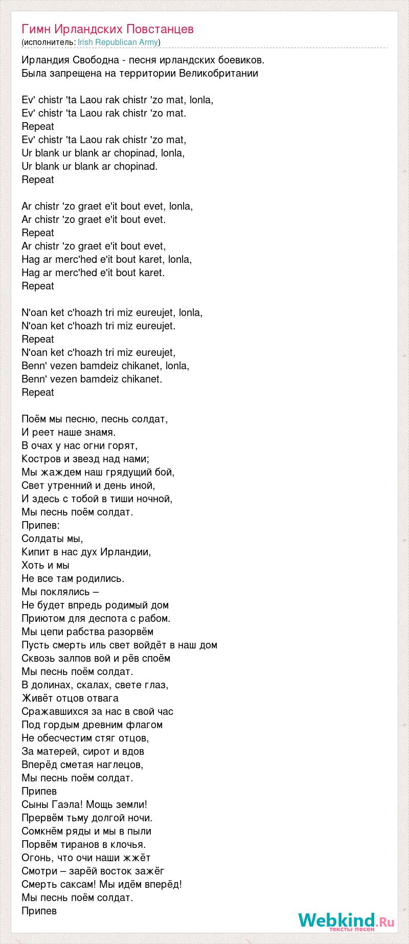Ирландия Свободна - песня ирландских боевиков. Была запрещена на территории Великобритании Ev' chistr 'ta Laou rak chistr 'zo mat, lonla, Ev' chistr 'ta Laou rak chistr 'zo mat. Repeat Ev' chistr 'ta Laou rak chistr 'zo mat, Ur blank ur blank ar chopinad, lonla, Ur blank ur blank ar chopinad. Repeat Ar chistr 'zo graet e'it bout evet, lonla, Ar chistr 'zo graet e'it bout evet. Repeat Ar chistr 'zo graet e'it bout evet, Hag ar merc'hed e'it bout karet, lonla, Hag ar merc'hed e'it bout karet. Repeat N'oan ket c'hoazh tri miz eureujet, lonla, N'oan ket c'hoazh tri miz eureujet. Repeat N'oan ket c'hoazh tri miz eureujet, Benn' vezen bamdeiz chikanet, lonla, Benn' vezen bamdeiz chikanet. Repeat Поём мы песню, песнь солдат, И реет наше знамя. В очах у нас огни горят, Костров и звезд над нами; Мы жаждем наш грядущий бой, Свет утренний и день иной, И здесь с тобой в тиши ночной, Мы песнь поём солдат. Припев: Солдаты мы, Кипит в нас дух Ирландии, Хоть и мы Не все там родились. Мы поклялись – Не будет впредь родимый дом Приютом для деспота с рабом. Мы цепи рабства разорвём Пусть смерть иль свет войдёт в наш дом Сквозь залпов вой и рёв споём Мы песнь поём солдат. В долинах, скалах, свете глаз, Живёт отцов отвага Сражавшихся за нас в свой час Под гордым древним флагом Не обесчестим стяг отцов, За матерей, сирот и вдов Вперёд сметая наглецов, Мы песнь поём солдат. Припев Сыны Гаэла! Мощь земли! Прервём тьму долгой ночи. Сомкнём ряды и мы в пыли Порвём тиранов в клочья. Огонь, что очи наши жжёт Смотри – зарёй восток зажёг Смерть саксам! Мы идём вперёд! Мы песнь поём солдат. Припев