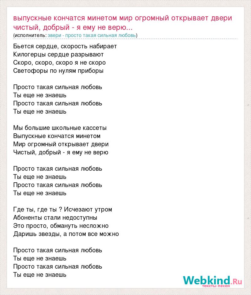 Бьется сердце, скорость набирает Килогерцы сердце разрывают Скоро, скоро, скоро я не скоро Светофоры по нулям приборы Просто такая сильная любовь Ты еще не знаешь Просто такая сильная любовь Ты еще не знаешь Мы большие школьные кассеты Выпускные кончатся минетом Мир огромный открывает двери Чистый, добрый - я ему не верю Просто такая сильная любовь Ты еще не знаешь Просто такая сильная любовь Ты еще не знаешь Где ты, где ты ? Исчезают утром Абоненты стали недоступны Это просто, обмануть несложно Даришь звезды, а потом все можно Просто такая сильная любовь Ты еще не знаешь Просто такая сильная любовь Ты еще не знаешь