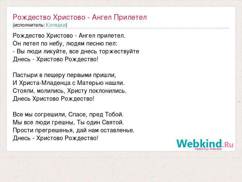 Рождество Христово - Ангел прилетел. Он летел по небу, людям песню пел: - Вы люди ликуйте, все днесь торжествуйте Днесь - Христово Рождество! Пастыри в пещеру первыми пришли, И Христа-Младенца с Матерью нашли. Стояли, молились, Христу поклонились. Днесь Христово Рождество! Все мы согрешили, Спасе, пред Тобой. Мы все люди грешны, Ты один Святой. Прости прегрешенья, дай нам оставленье. Днесь - Христово Рождество!