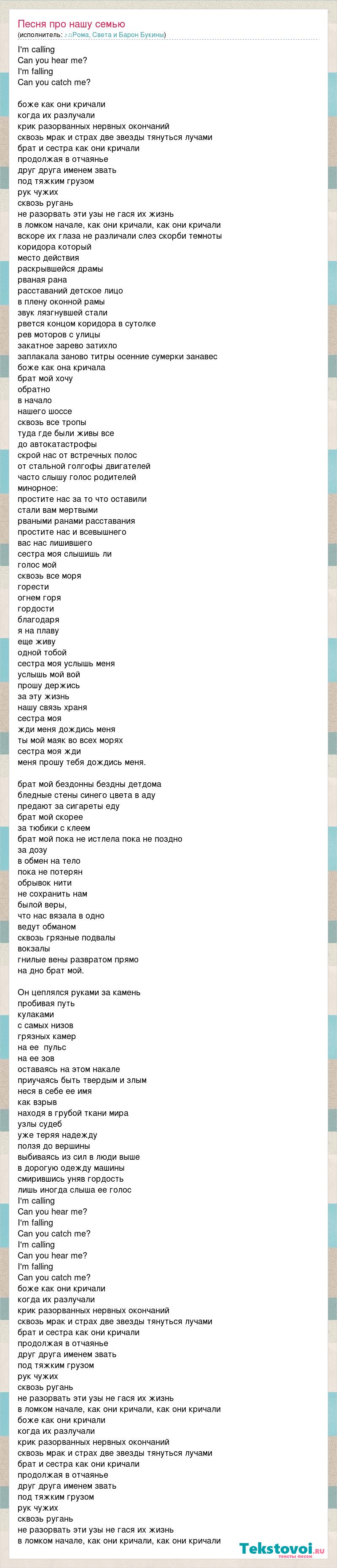 I'm calling Can you hear me? I'm falling Can you catch me? боже как они кричали когда их разлучали крик разорванных нервных окончаний сквозь мрак и страх две звезды тянуться лучами брат и сестра как они кричали продолжая в отчаянье друг друга именем звать под тяжким грузом рук чужих сквозь ругань не разорвать эти узы не гася их жизнь в ломком начале, как они кричали, как они кричали вскоре их глаза не различали слез скорби темноты коридора который место действия раскрывшейся драмы рваная рана расставаний детское лицо в плену оконной рамы звук лязгнувшей стали рвется концом коридора в сутолке рев моторов с улицы закатное зарево затихло заплакала заново титры осенние сумерки занавес боже как она кричала брат мой хочу обратно в начало нашего шоссе сквозь все тропы туда где были живы все до автокатастрофы скрой нас от встречных полос от стальной голгофы двигателей часто слышу голос родителей минорное: простите нас за то что оставили стали вам мертвыми рваными ранами расставания простите нас и всевышнего вас нас лишившего сестра моя слышишь ли голос мой сквозь все моря горести огнем горя гордости благодаря я на плаву еще живу одной тобой сестра моя услышь меня услышь мой вой прошу держись за эту жизнь нашу связь храня сестра моя жди меня дождись меня ты мой маяк во всех морях сестра моя жди меня прошу тебя дождись меня. брат мой бездонны бездны детдома бледные стены синего цвета в аду предают за сигареты еду брат мой скорее за тюбики с клеем брат мой пока не истлела пока не поздно за дозу в обмен на тело пока не потерян обрывок нити не сохранить нам былой веры, что нас вязала в одно ведут обманом сквозь грязные подвалы вокзалы гнилые вены развратом прямо на дно брат мой. Он цеплялся руками за камень пробивая путь кулаками с самых низов грязных камер на ее пульс на ее зов оставаясь на этом накале приучаясь быть твердым и злым неся в себе ее имя как взрыв находя в грубой ткани мира узлы судеб уже теряя надежду ползя до вершины выбиваясь из сил в люди выше в дорогую одежду машины смирившись уняв гордость лишь иногда слыша ее голос I'm calling Can you hear me? I'm falling Can you catch me? I'm calling Can you hear me? I'm falling Can you catch me? боже как они кричали когда их разлучали крик разорванных нервных окончаний сквозь мрак и страх две звезды тянуться лучами брат и сестра как они кричали продолжая в отчаянье друг друга именем звать под тяжким грузом рук чужих сквозь ругань не разорвать эти узы не гася их жизнь в ломком начале, как они кричали, как они кричали боже как они кричали когда их разлучали крик разорванных нервных окончаний сквозь мрак и страх две звезды тянуться лучами брат и сестра как они кричали продолжая в отчаянье друг друга именем звать под тяжким грузом рук чужих сквозь ругань не разорвать эти узы не гася их жизнь в ломком начале, как они кричали, как они кричали
